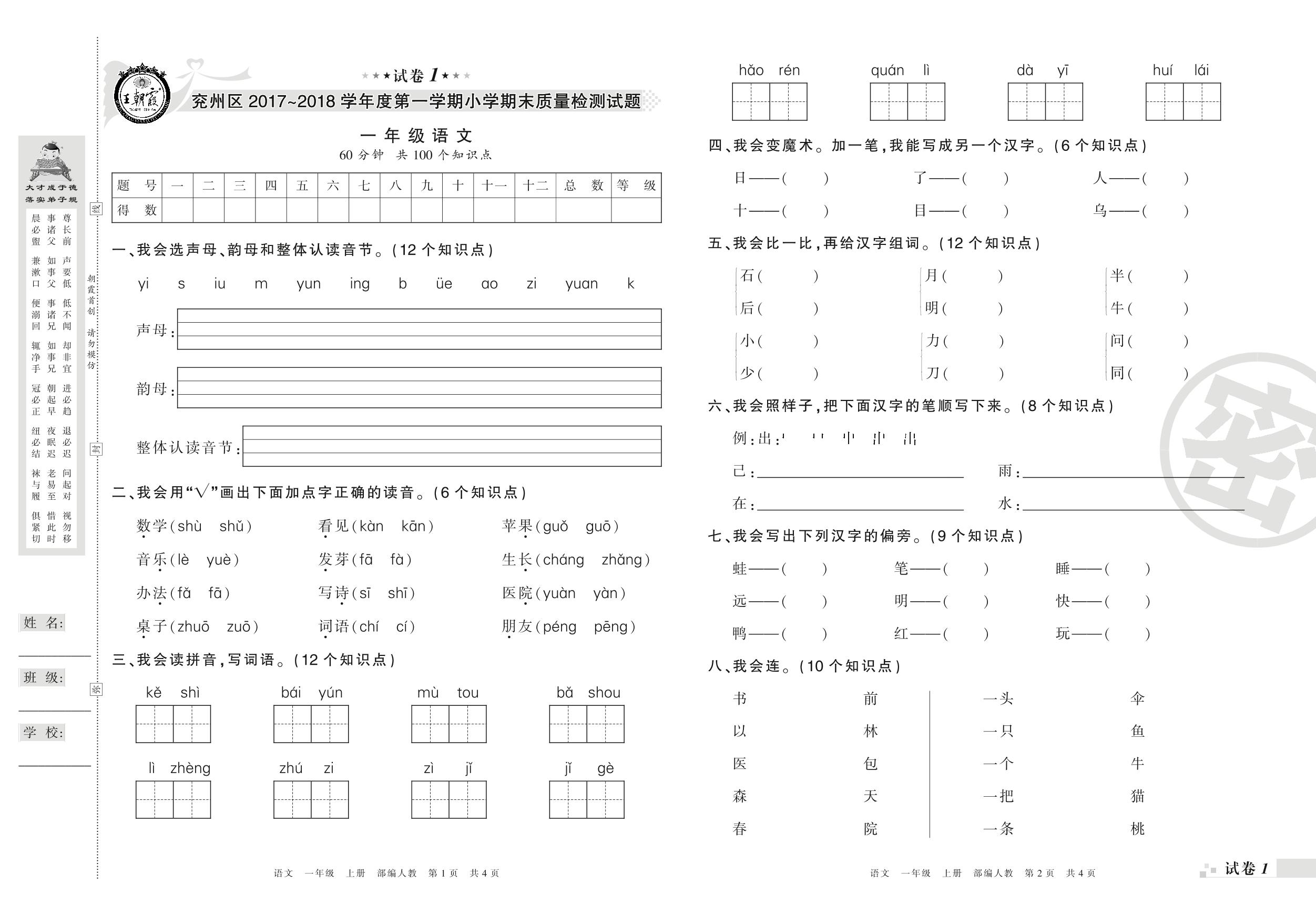 2017-2018学年第一学期济宁市兖州区一年级语文试卷(人教版)【1】