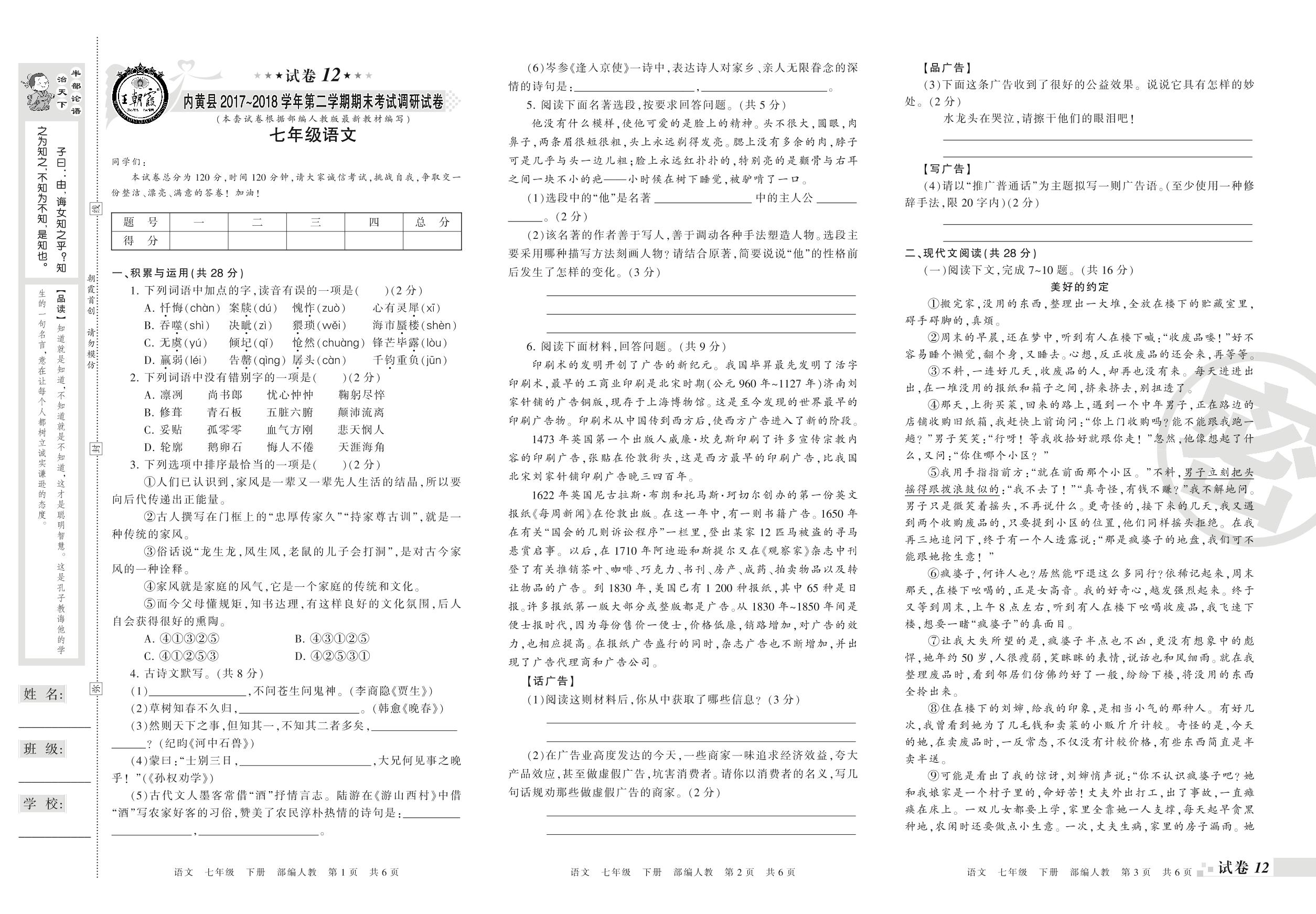 2016-2017学年第二学期安阳市内黄县七年级语文试卷(人教版)【12】