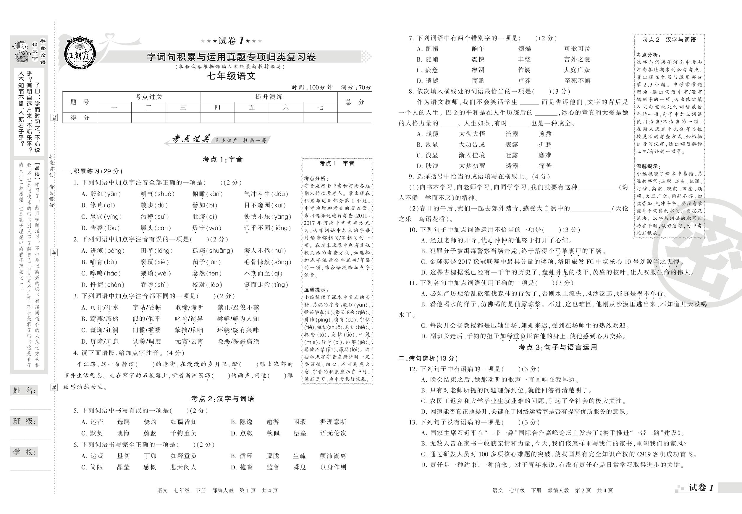 王朝霞期末专项卷——字词句积累与运用真题专项归类复习卷七年级下册语文(人教版)_R210802165721【1】