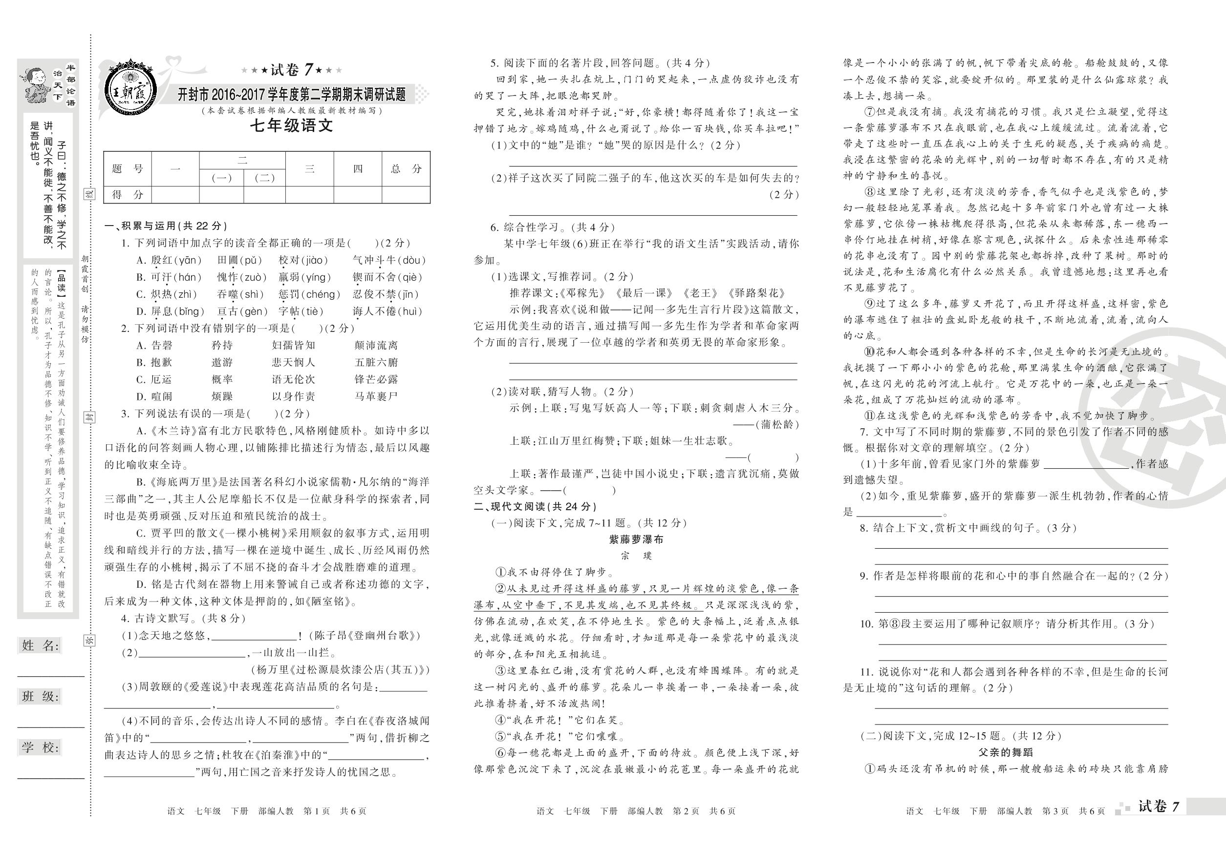2016-2017学年第二学期开封市七年级语文试卷(人教版)【7】