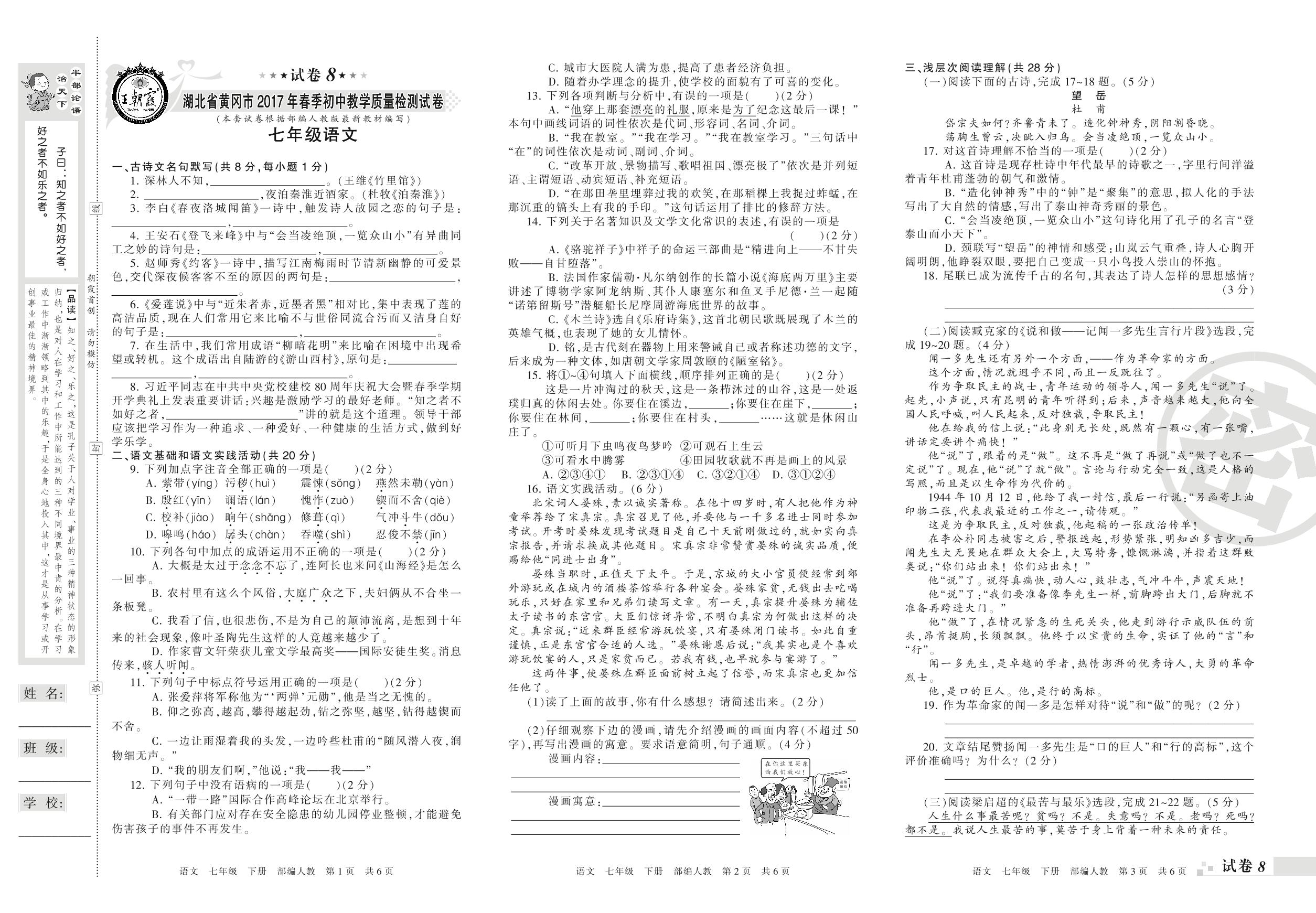 2016-2017学年第二学期湖北省黄冈市七年级语文试卷(人教版)_R210802165825【8】
