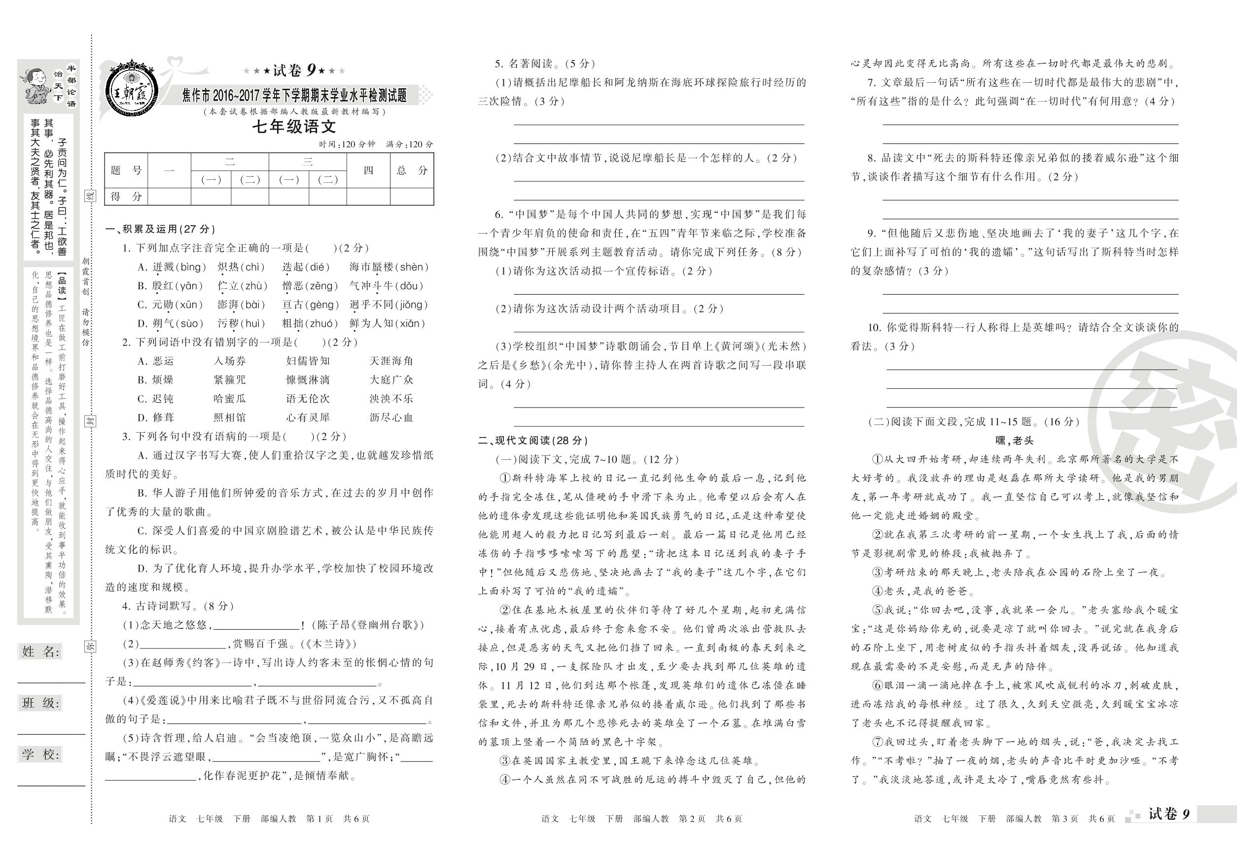 2016-2017学年第二学期焦作市七年级语文试卷(人教版)【9】