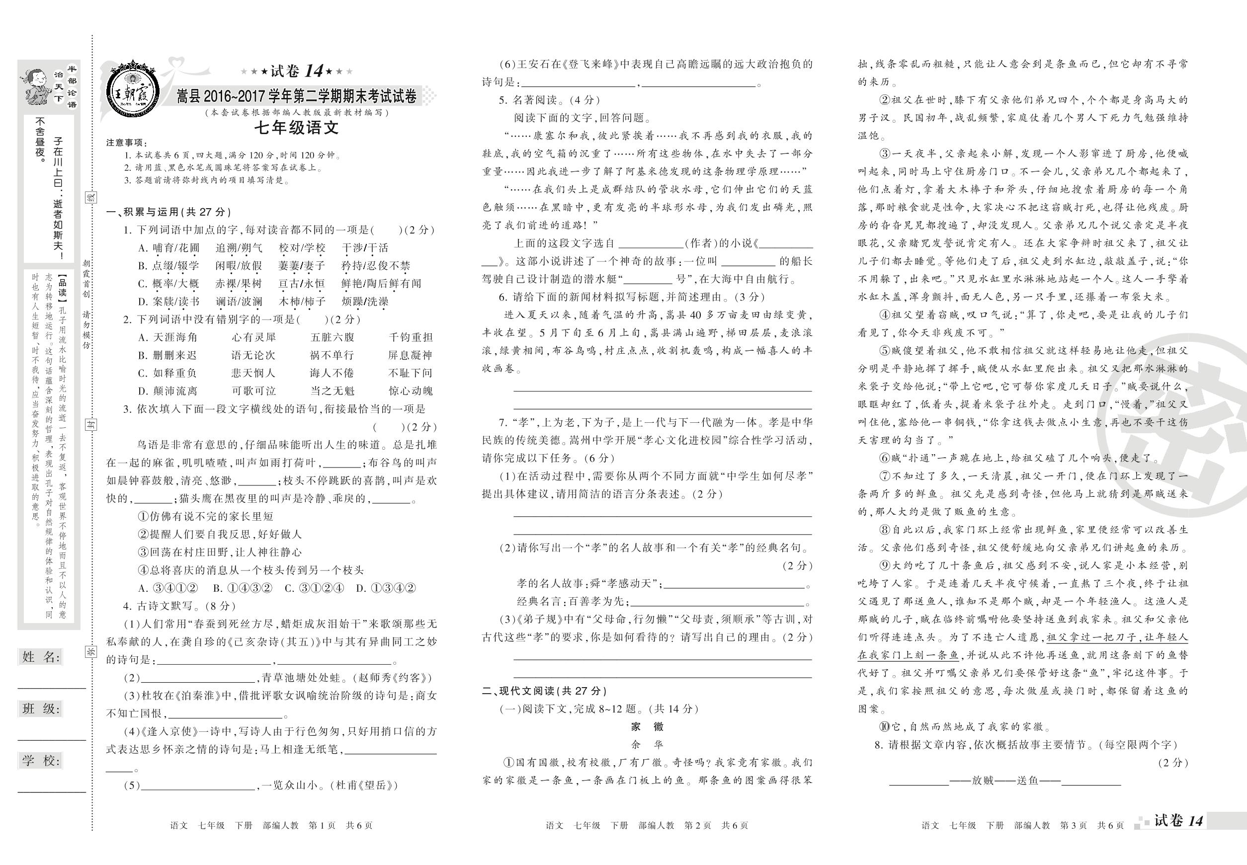 2016-2017学年第二学期洛阳市嵩县七年级语文试卷(人教版)【14】
