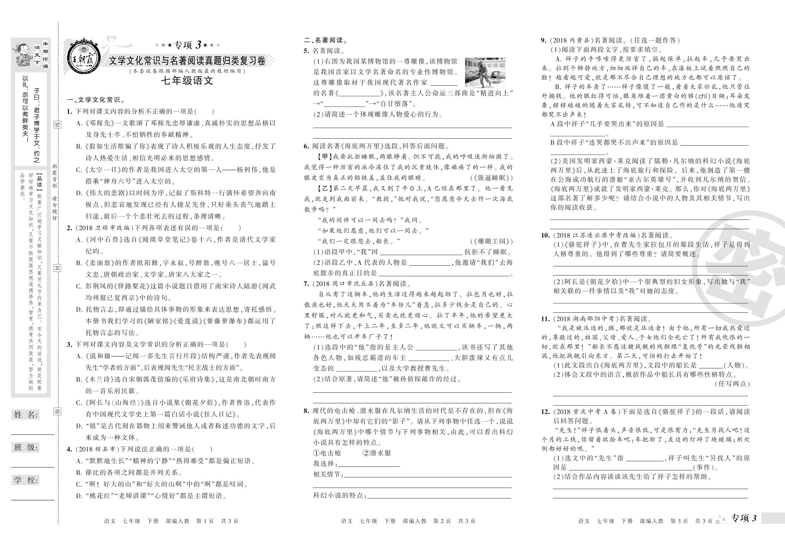 王朝霞期末专项卷——文学文化常识与名著阅读、综合性学习真题归类复习卷七年级下册语文(人教版)_R210802171814【0】