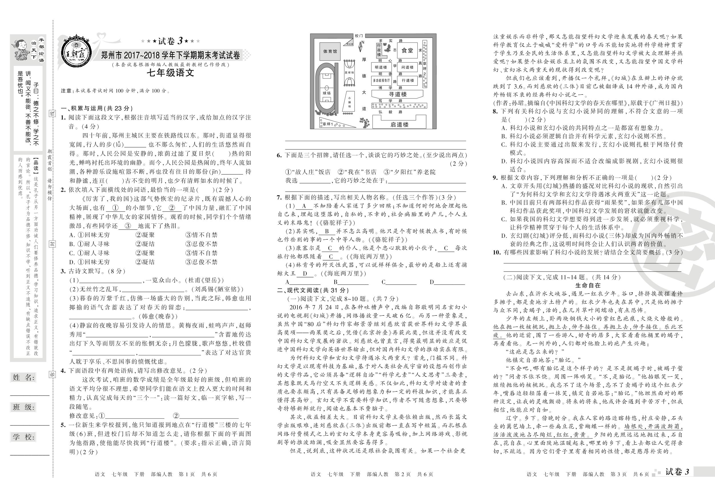 2017-2018学年第二学期郑州市七年级语文试卷(人教版)【3】