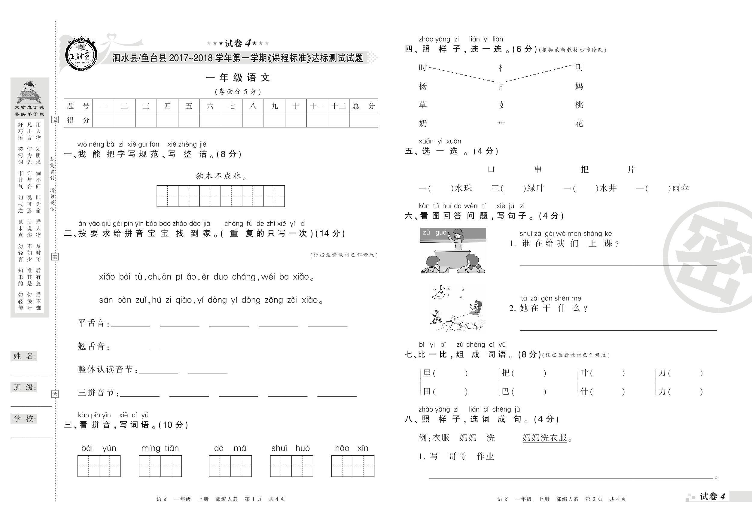 2017-2018学年第一学期济宁市泗水县(鱼台县)一年级语文试卷(人教版)【4】