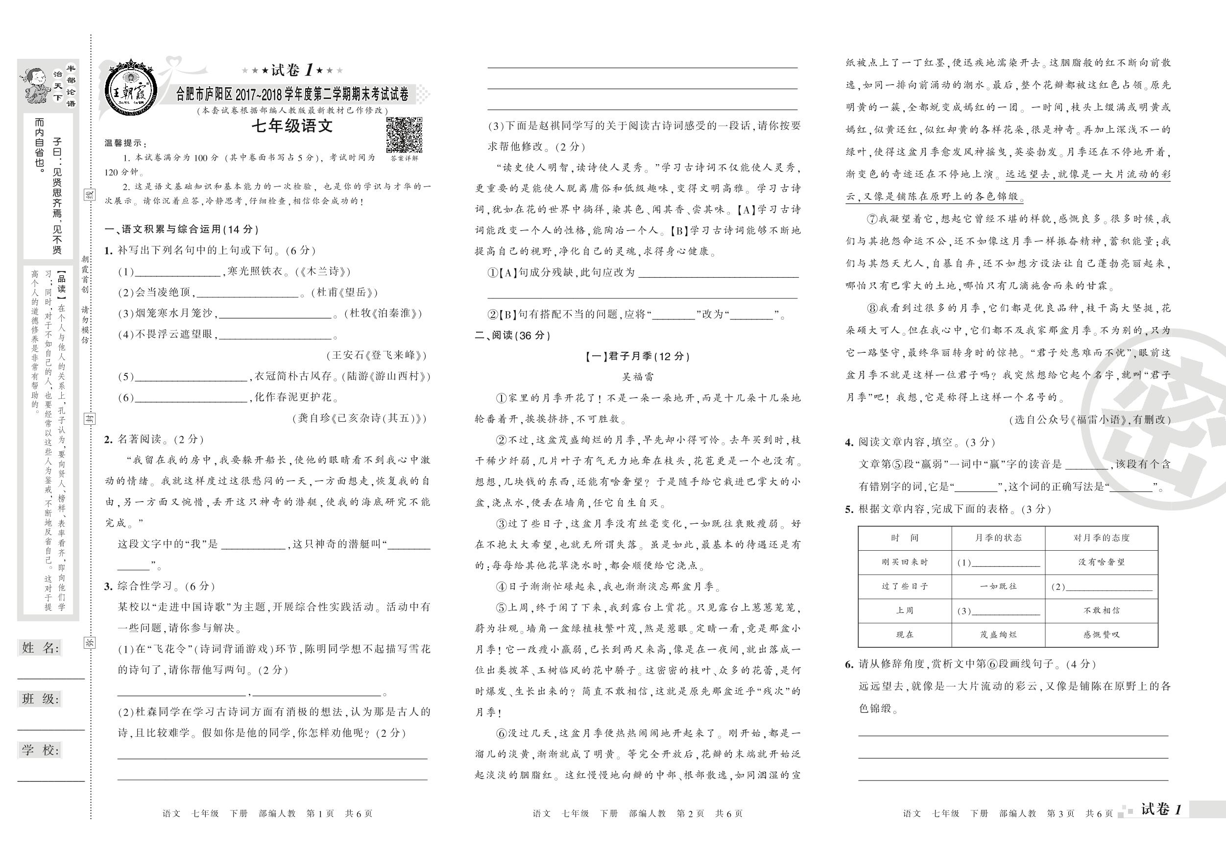 2017-2018学年第二学期合肥市庐阳区七年级语文试卷(人教版)【1】