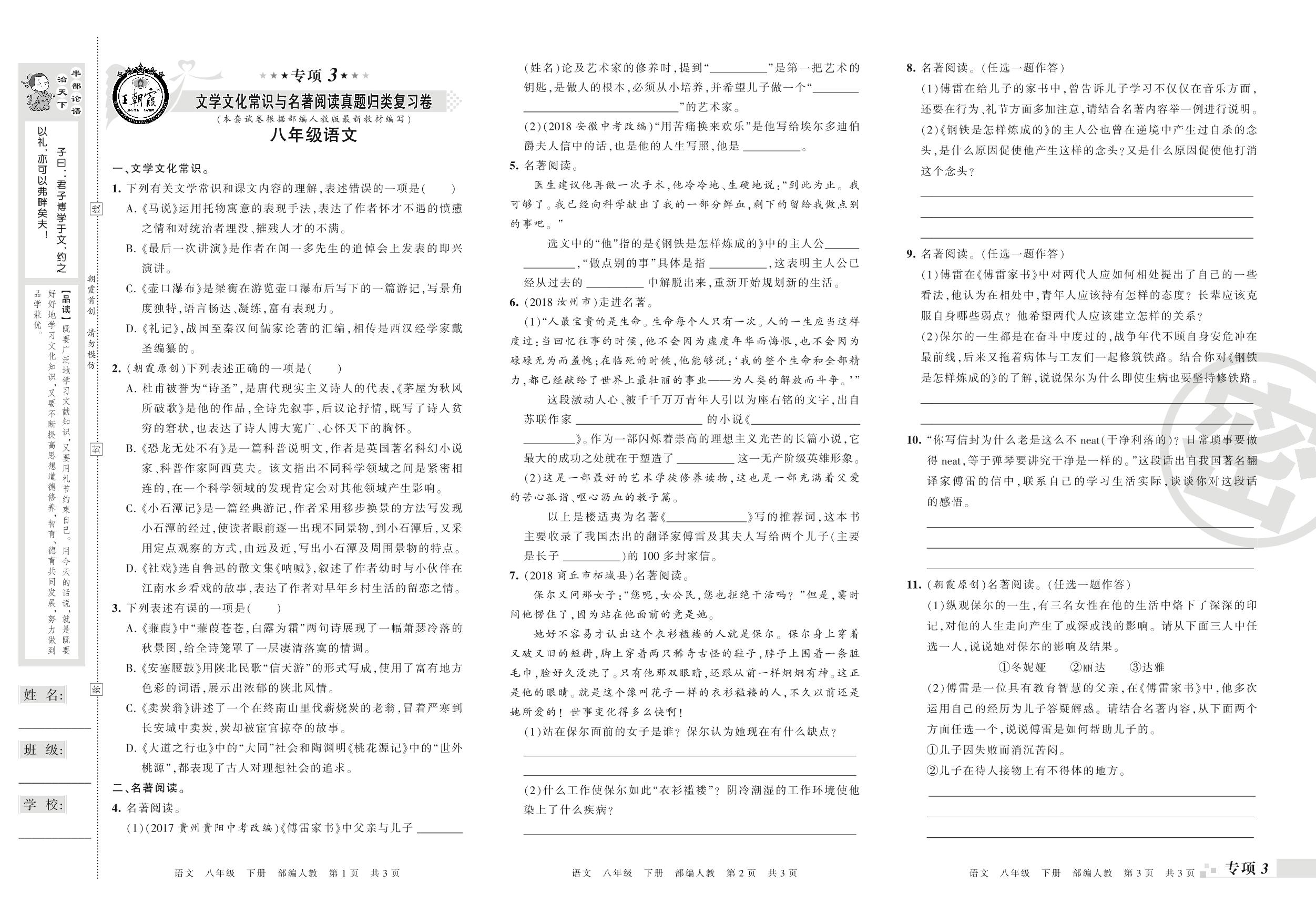 王朝霞期末专项卷——文学文化常识与名著阅读、综合性学习真题归类复习卷八年级下册语文(人教版)_R210802174033【0】