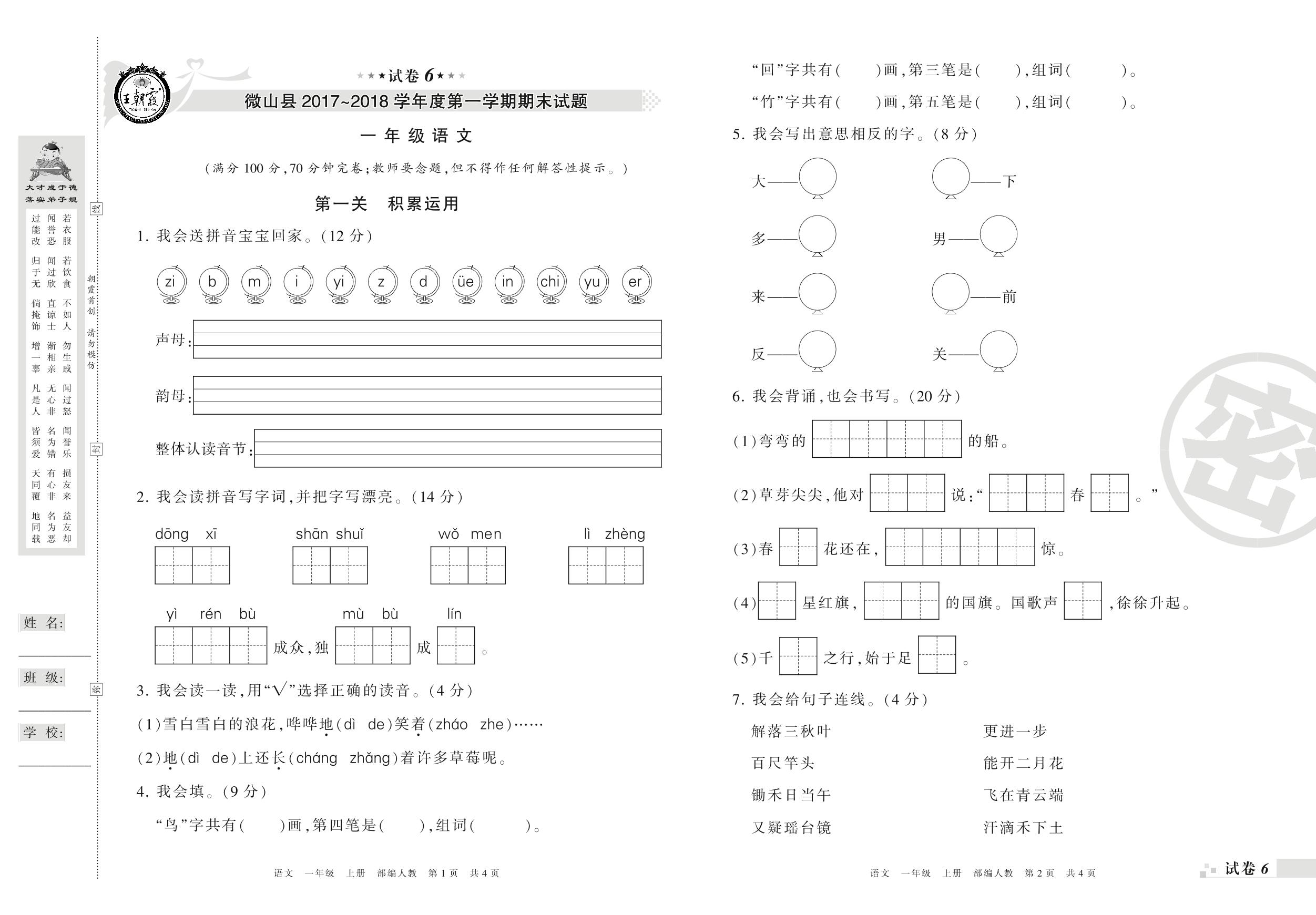 2017-2018学年第一学期济宁市微山县一年级语文试卷(人教版)【6】