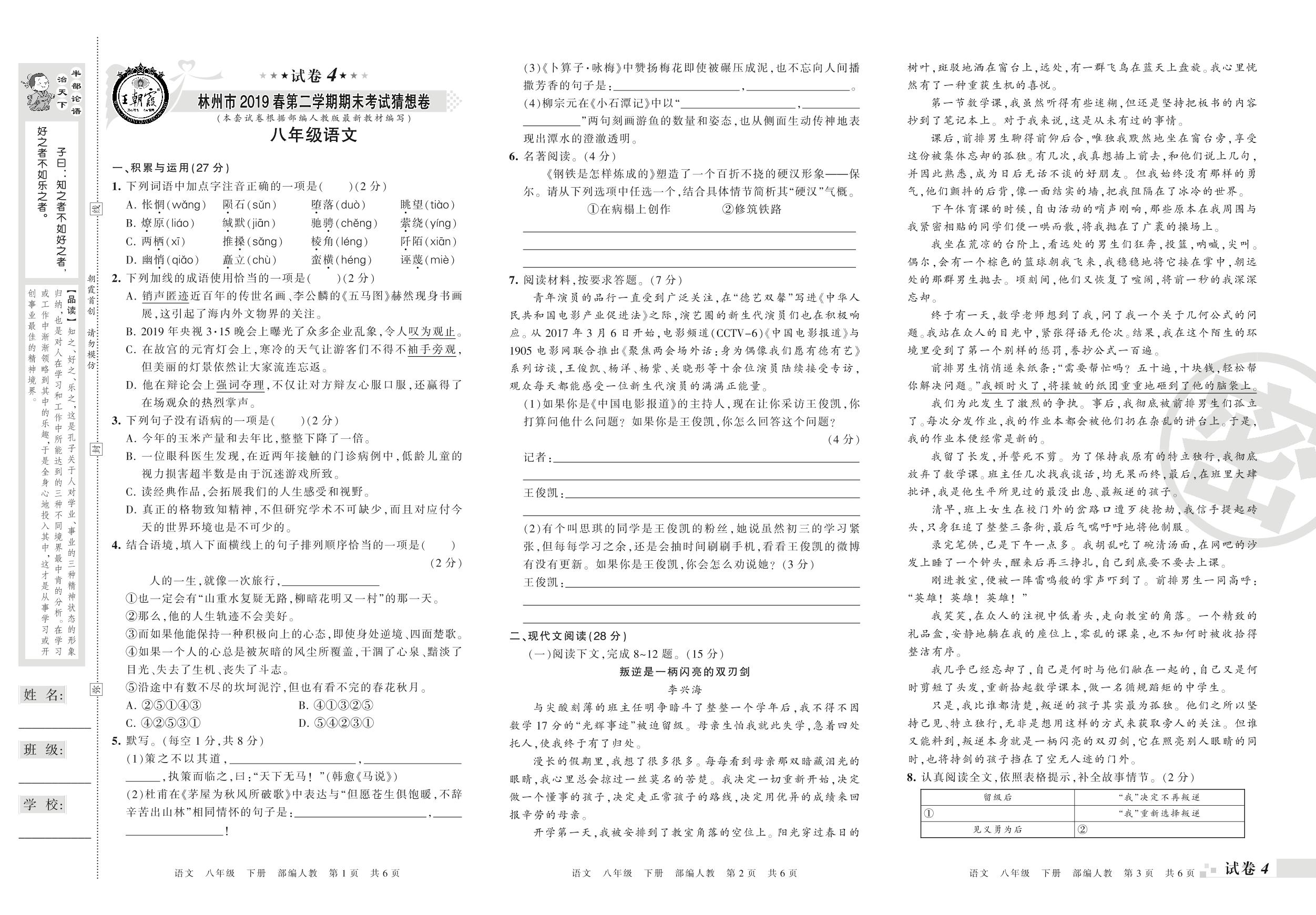 2018-2019学年第二学期林州市猜想卷八年级语文试卷(人教版)【4】