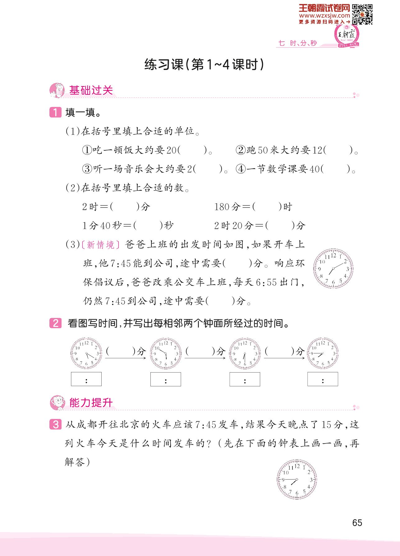 2023下册二年级数学北师版 七 时、分、秒——练习课(第1~4课时)