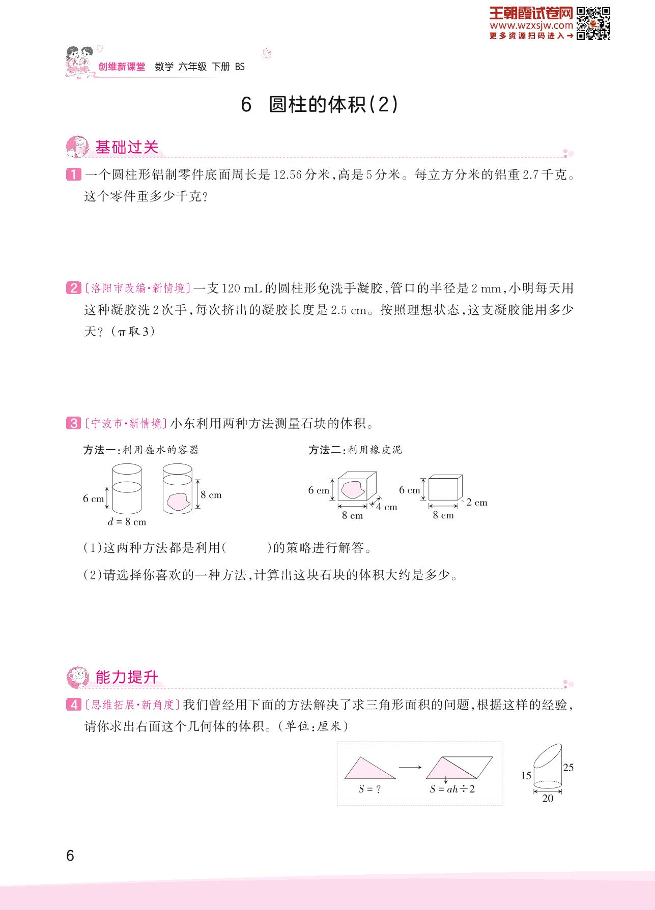 2023下册六年级数学北师版 一 圆柱与圆锥——6 圆柱的体积(2)