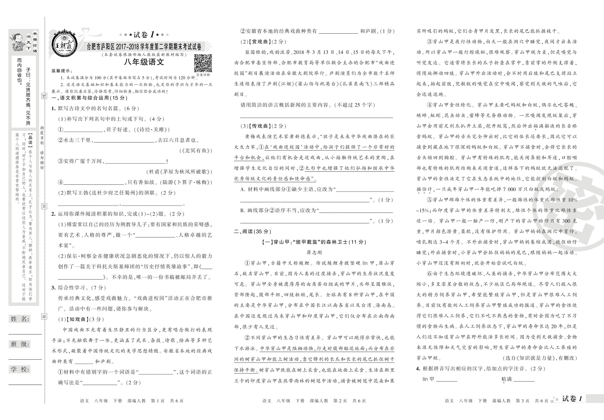 2017-2018学年第二学期合肥市庐阳区八年级语文试卷(人教版)【1】