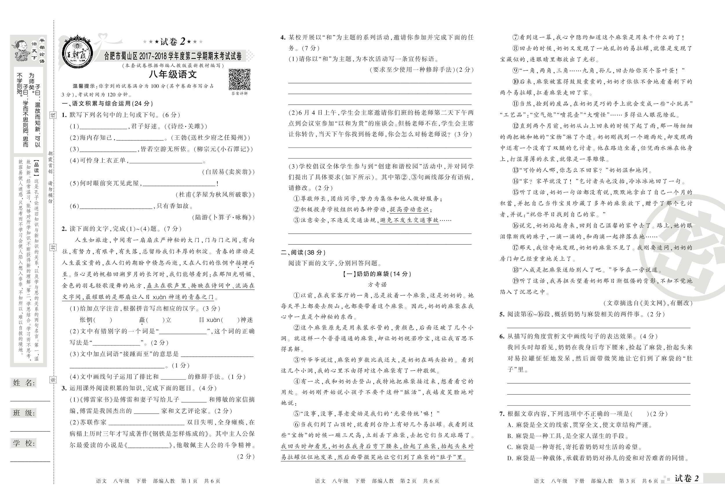 2017-2018学年第二学期合肥市蜀山区八年级语文试卷(人教版)【2】