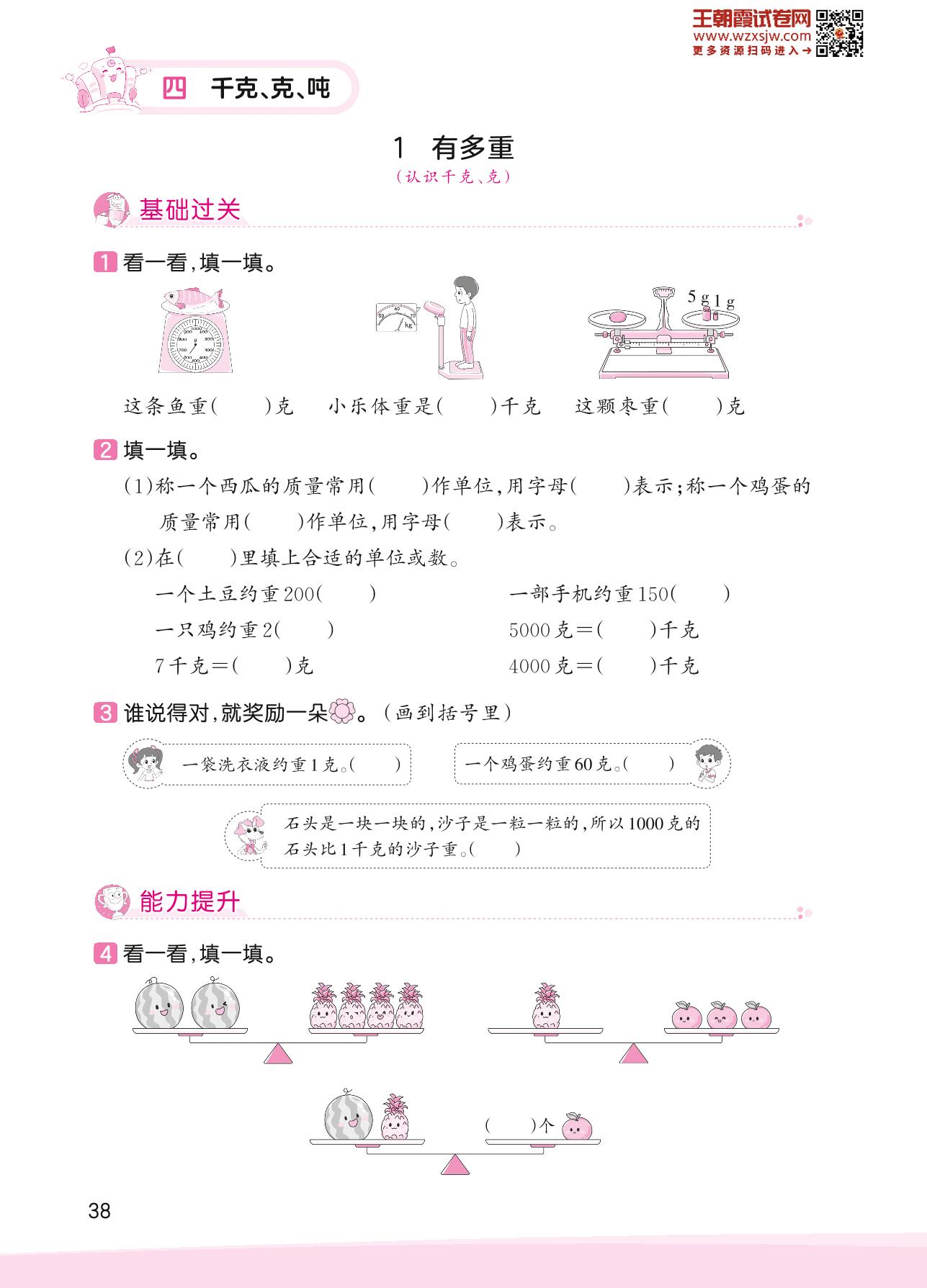 2023下册三年级数学北师版 四 千克、克、吨——1 有多重