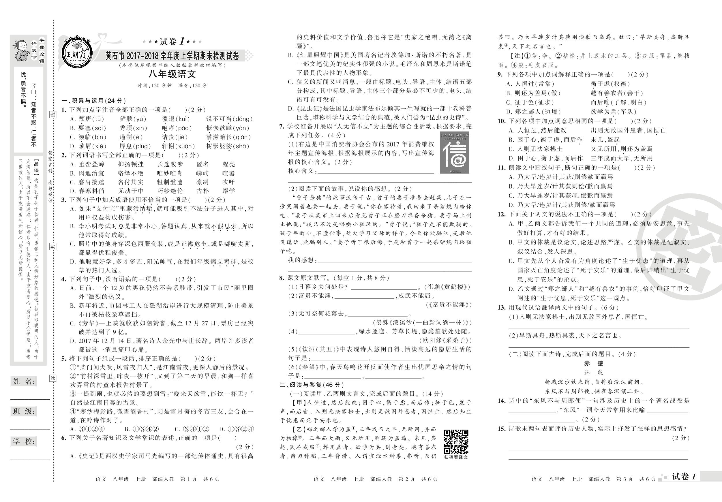 2017-2018学年第一学期黄石市八年级语文试卷(人教版)【1】