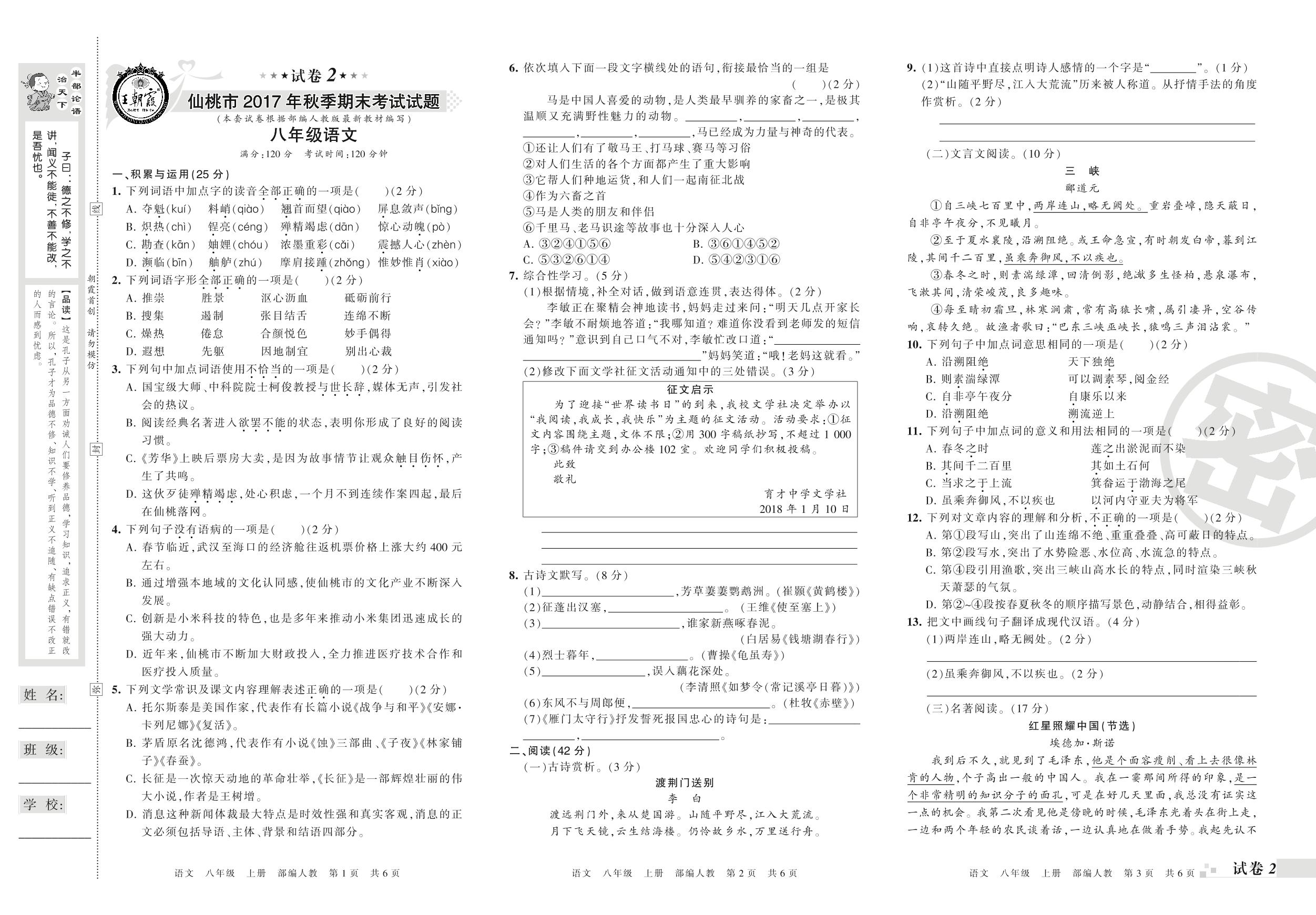 2017-2018学年第一学期仙桃市八年级语文试卷(人教版)【2】