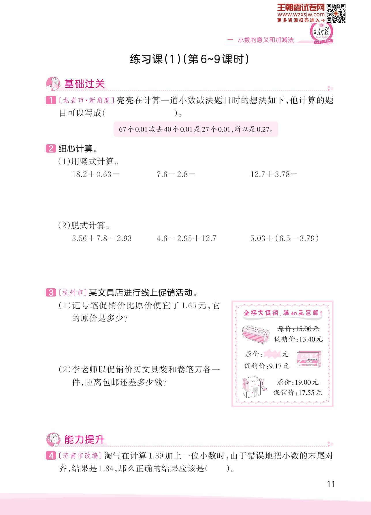 2023下册四年级数学北师版 一 小数的意义和加减法——练习课(1)(第6~9课时)