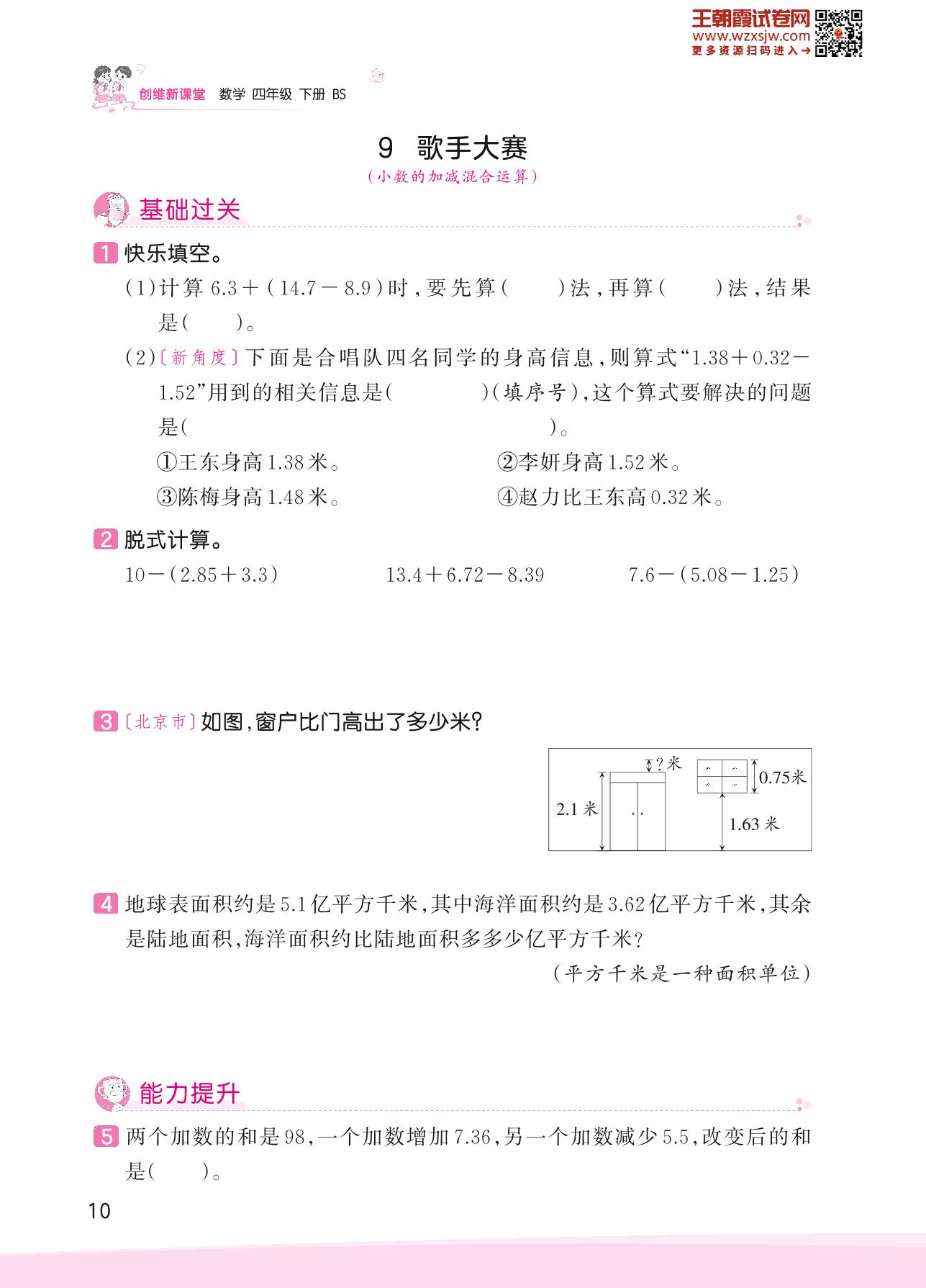 2023下册四年级数学北师版 一 小数的意义和加减法——9 歌手大赛
