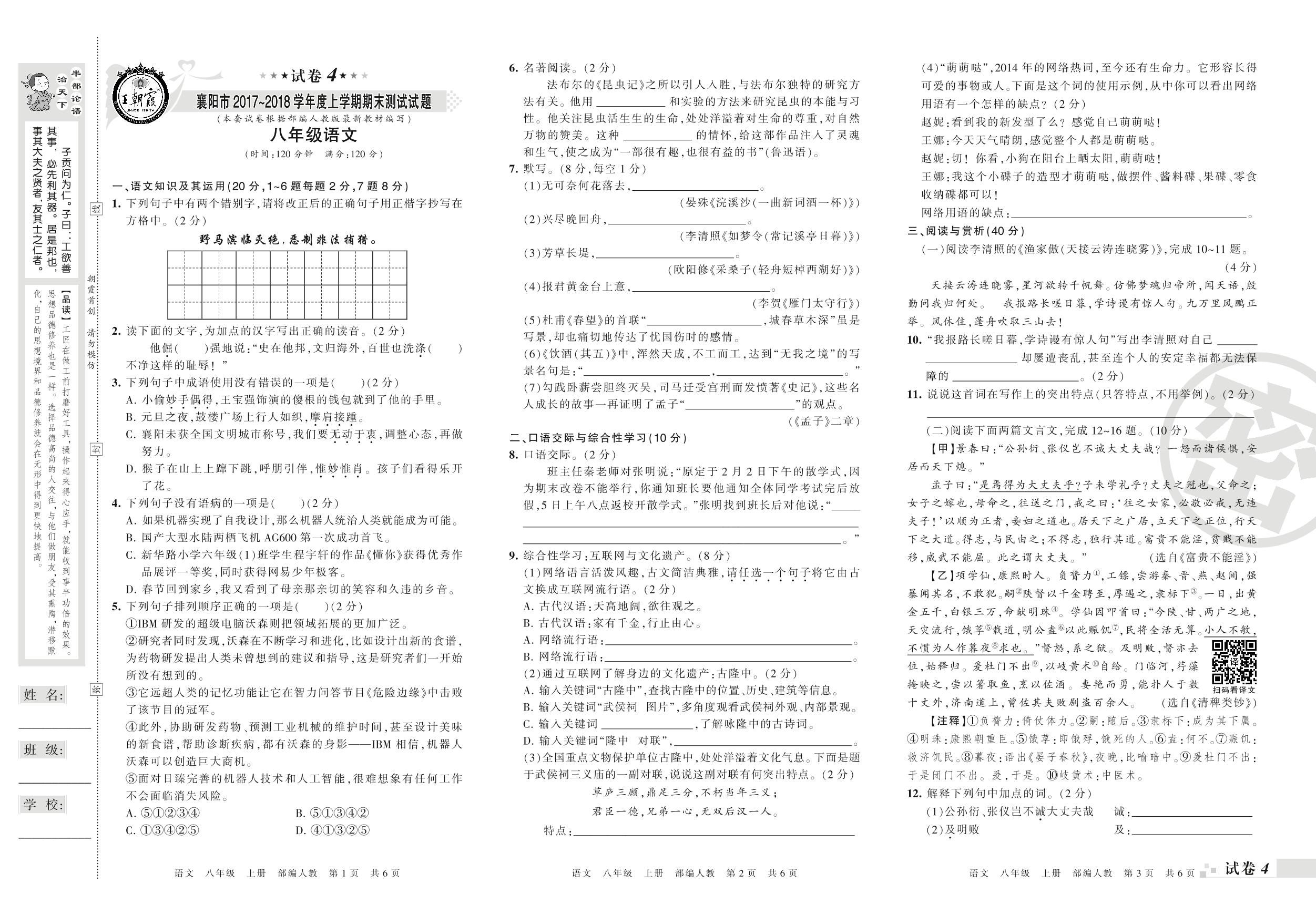 2017-2018学年第一学期襄阳市八年级语文试卷(人教版)【4】