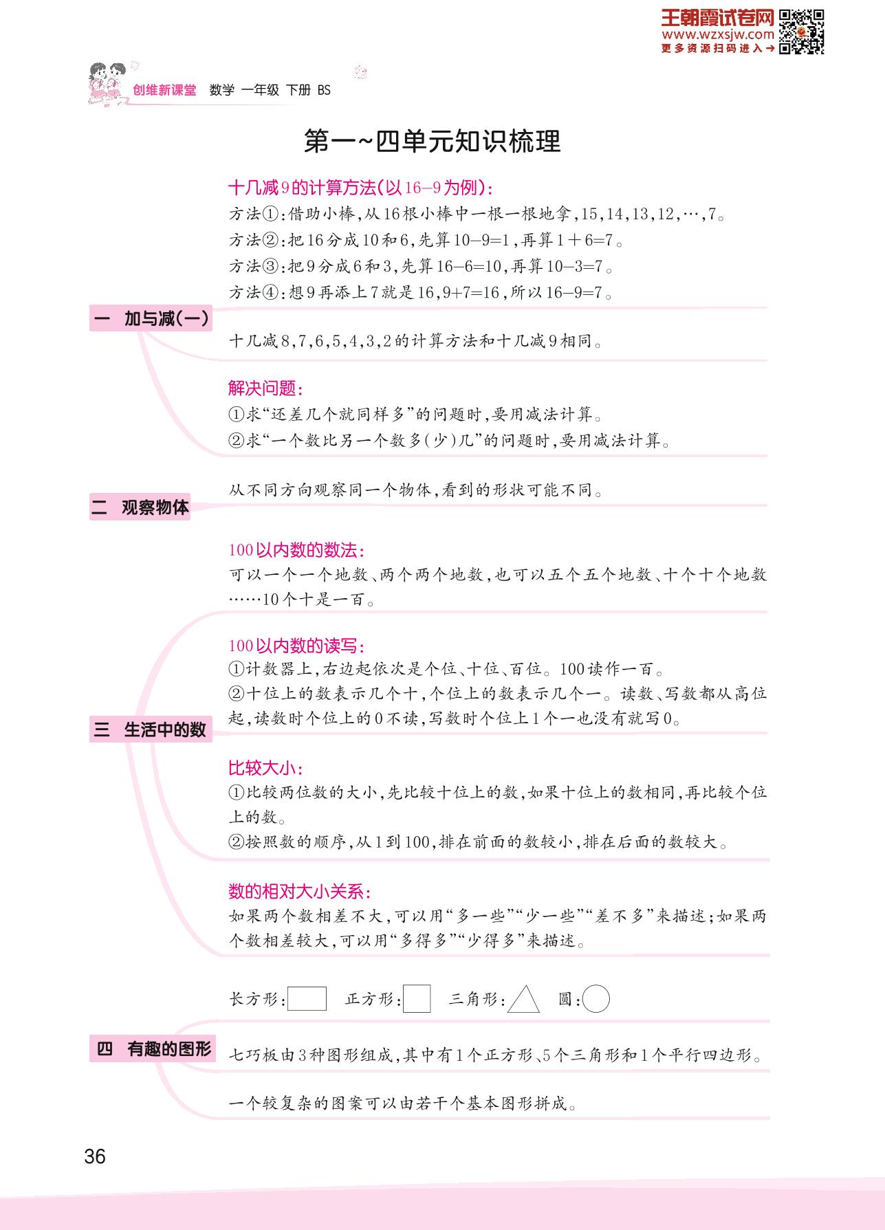 2023下册一年级数学北师版 第一~四单元知识梳理