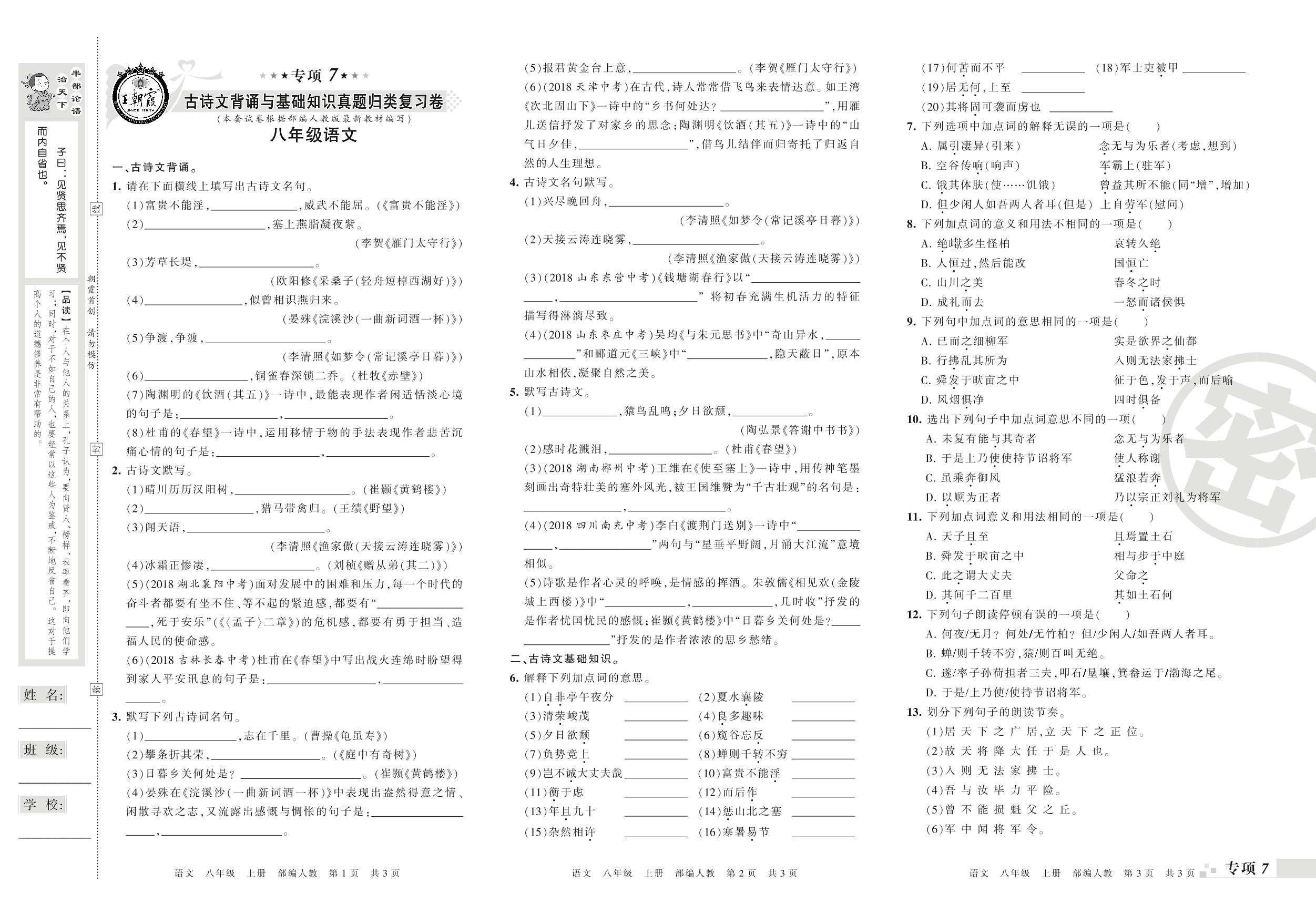 王朝霞期末专项卷——古诗文背诵与基础知识、古诗阅读真题归类复习卷八年级上册语文(人教版)_R210802181108【0】
