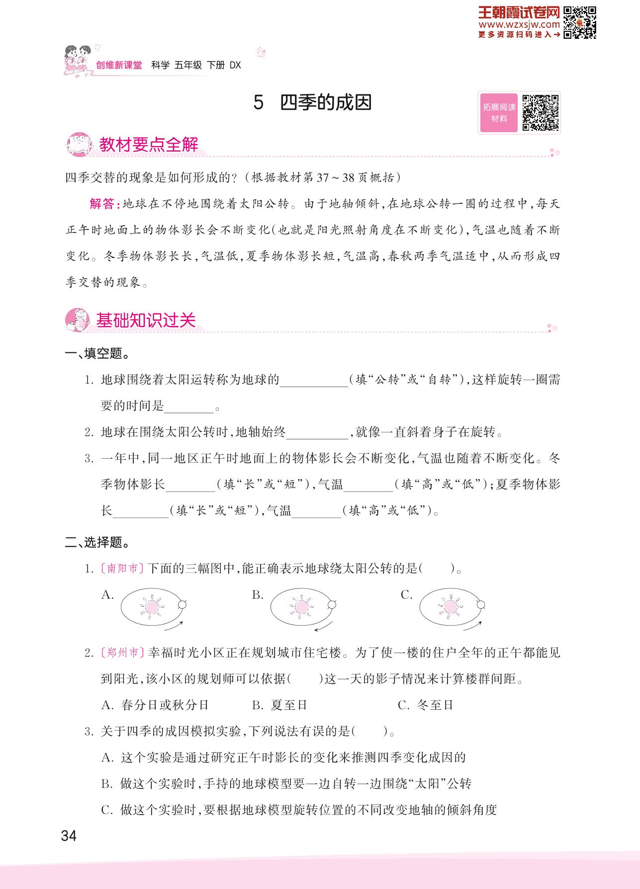 2023下册五年级科学大象版 第三单元 转动的地球——5 四季的成因