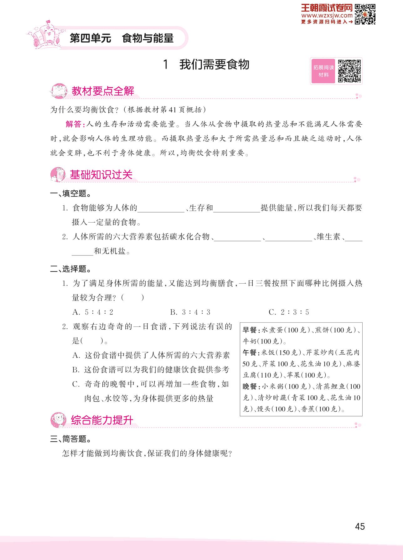 2023下册五年级科学大象版 第四单元 食物与能量——1 我们需要食物