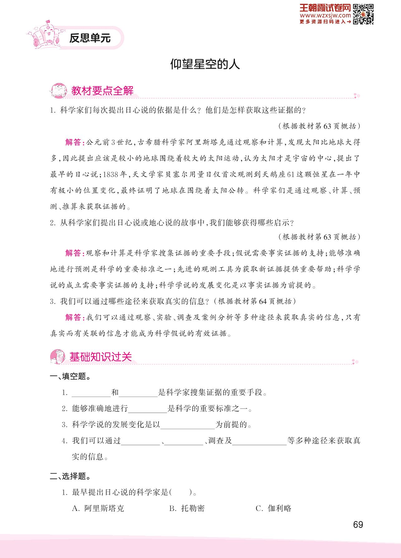 2023下册五年级科学大象版 反思单元——仰望星空的人
