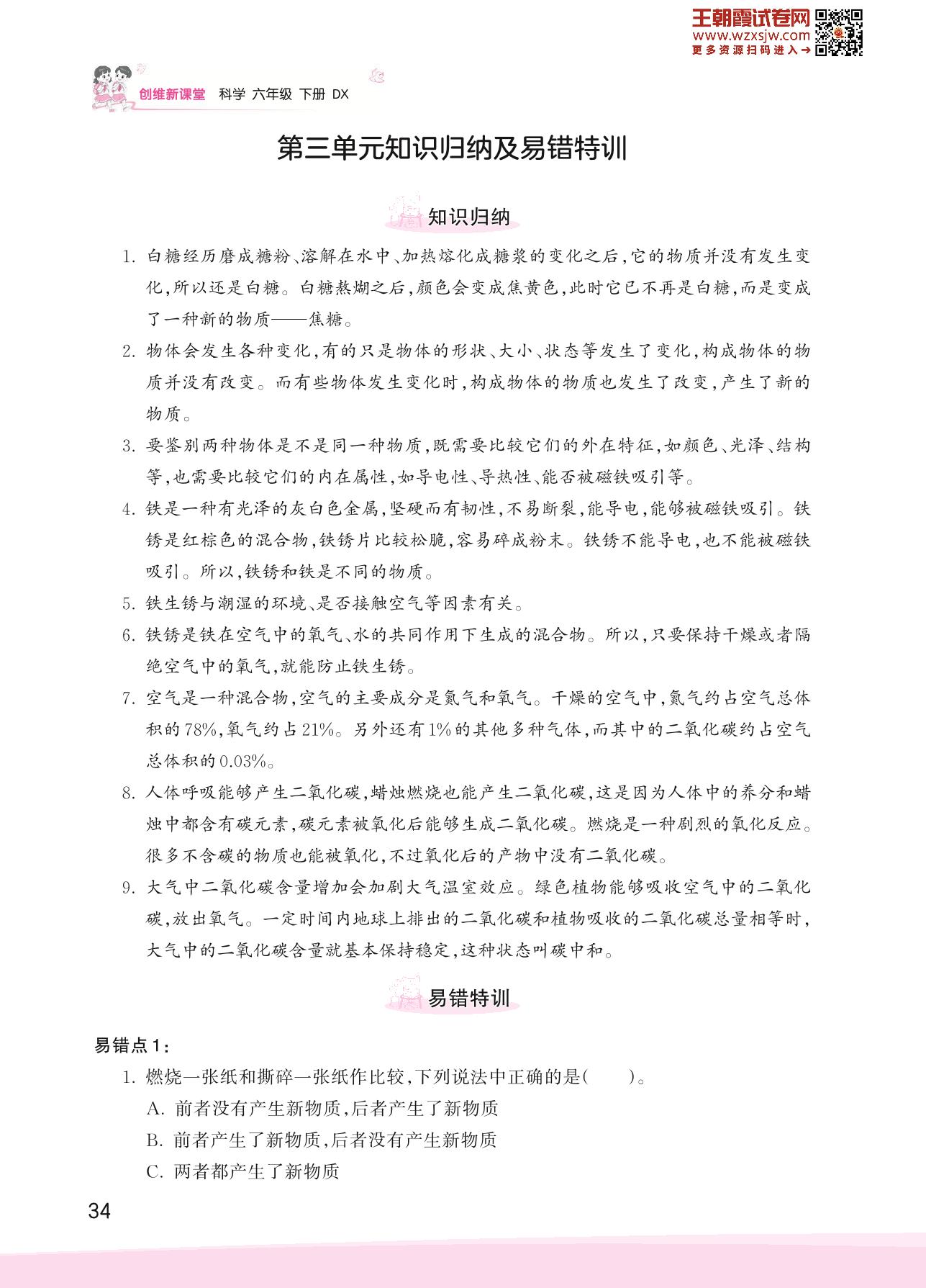 2023下册六年级科学大象版 第三单元知识归纳及易错特训