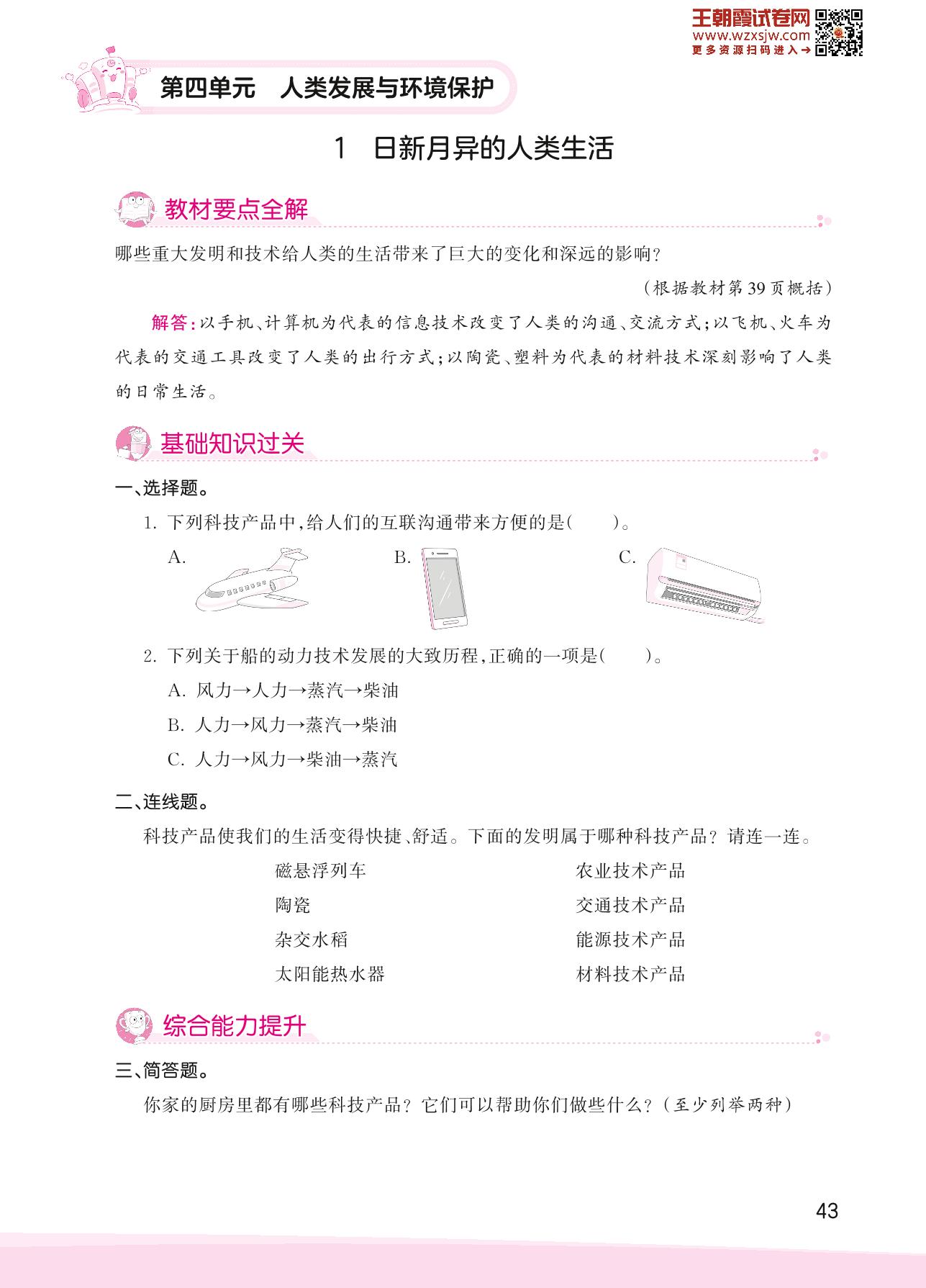 2023下册六年级科学大象版 第四单元 人类发展与环境保护——1 日新月异的人类生活