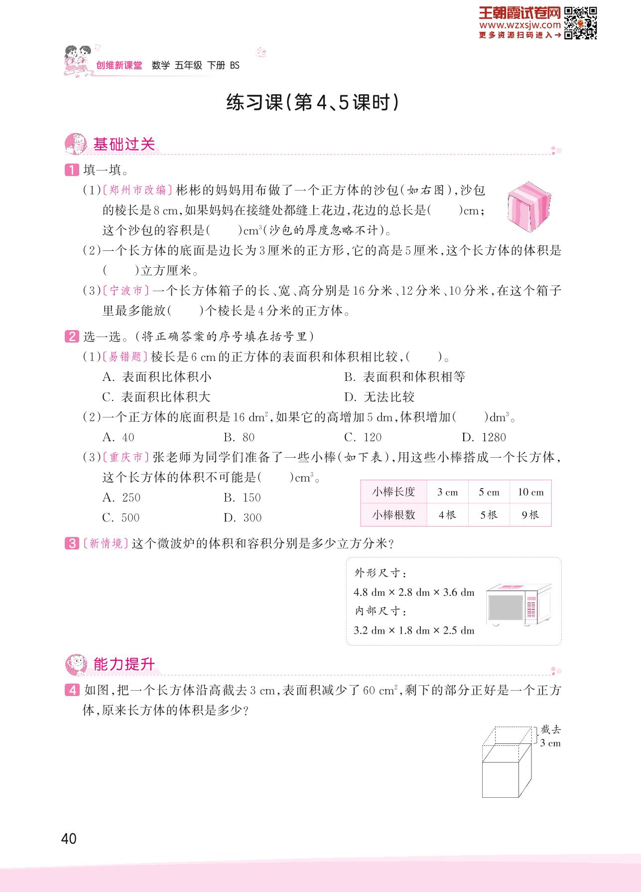 2023下册五年级数学北师版 四 长方体(二)——练习课(第4、5课时)