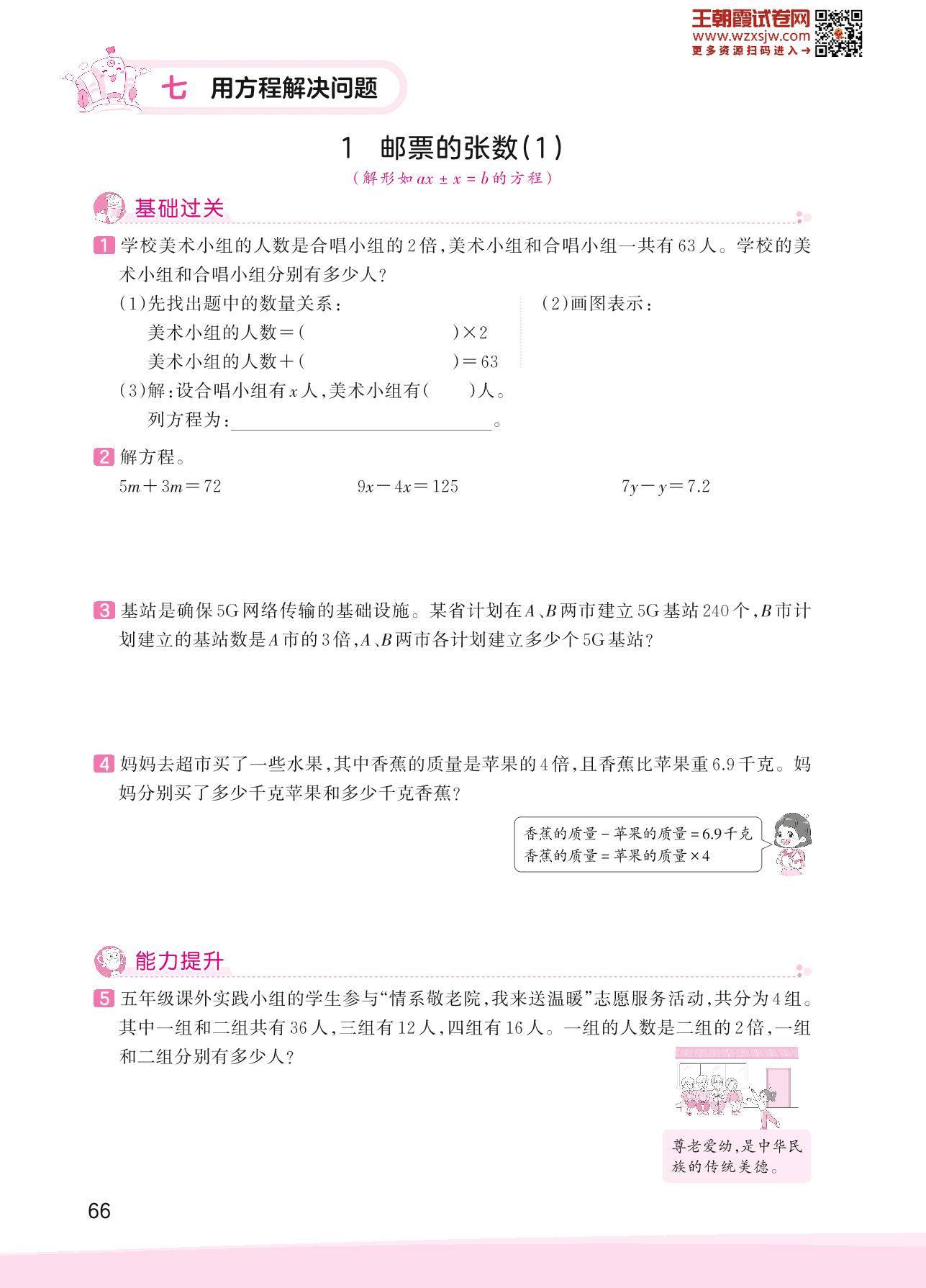 2023下册五年级数学北师版 七 用方程解决问题——1 邮票的张数(1)