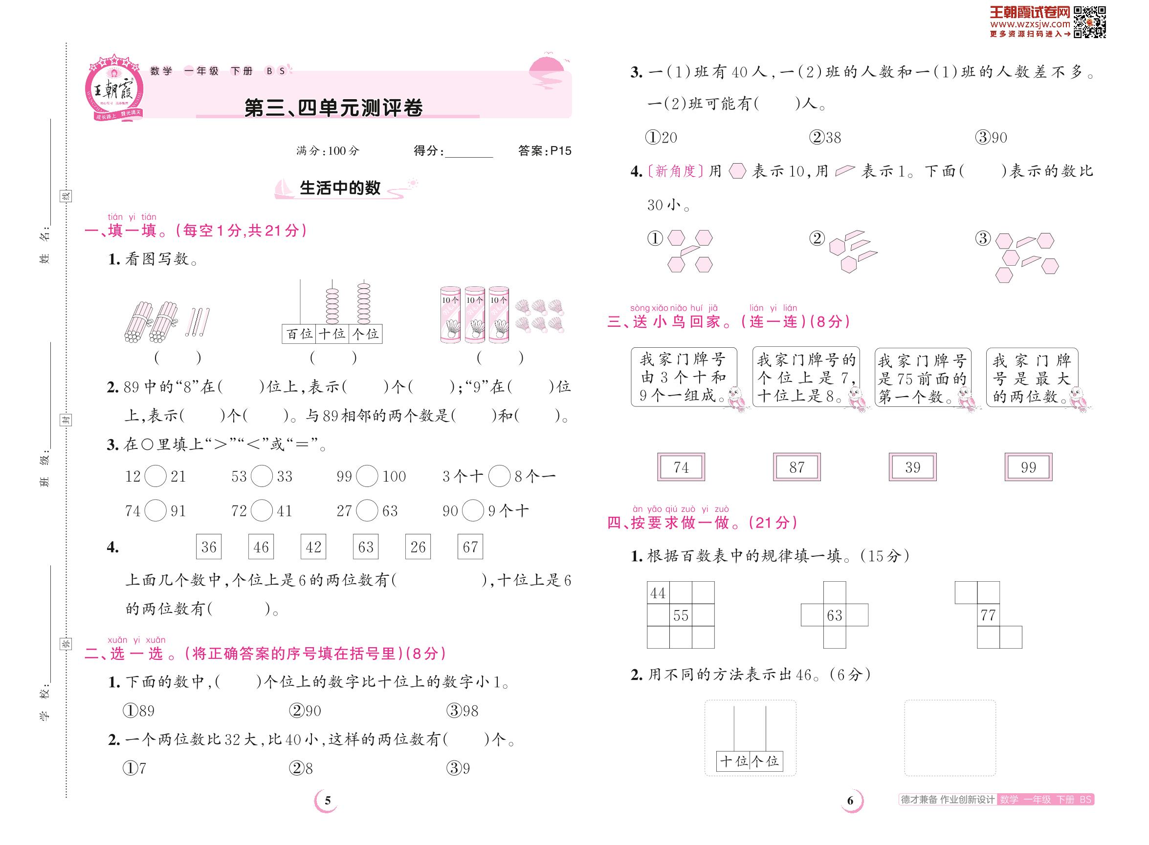 2023下册一年级数学北师版 第三、四单元测评卷