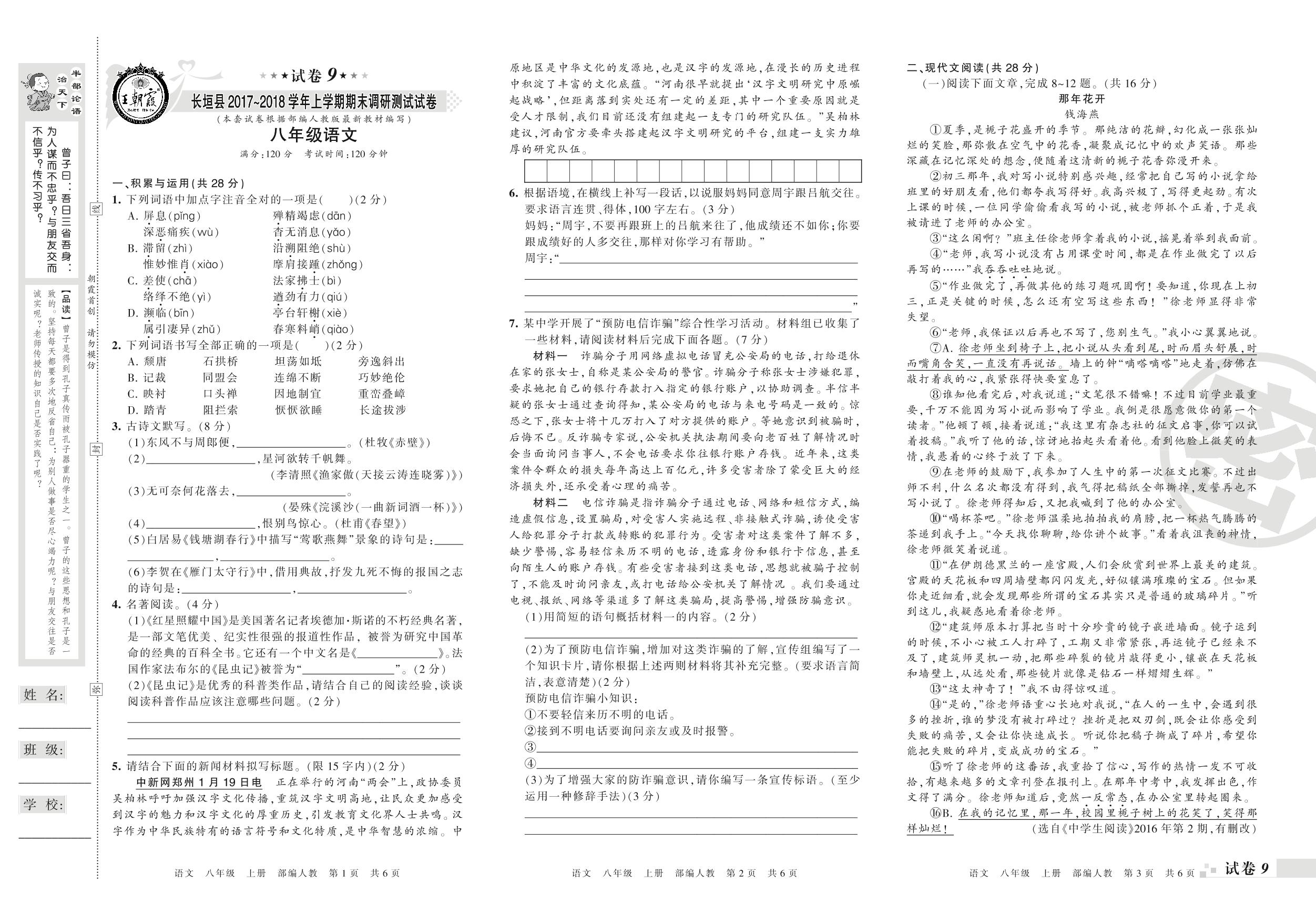 2017-2018学年第一学期新乡市长垣县八年级语文试卷(人教版)【9】