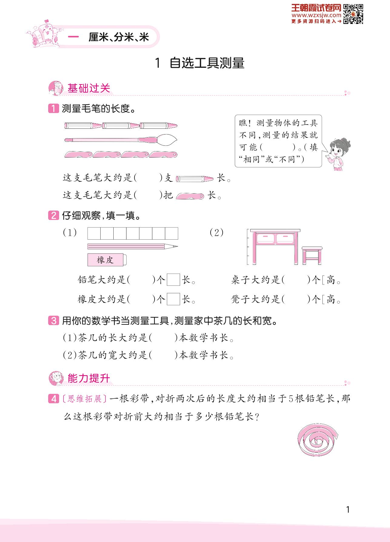 2023下册二年级数学冀教版 一 厘米、分米、米——1 自选工具测量