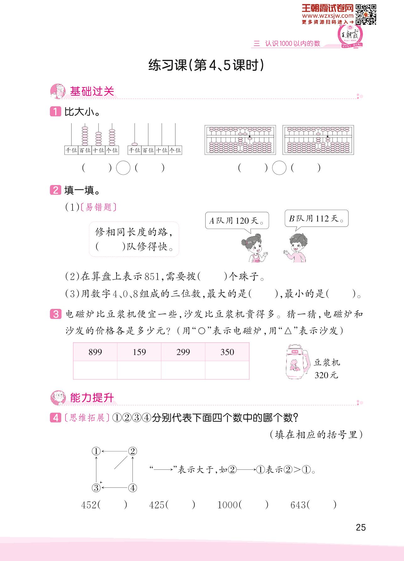 2023下册二年级数学冀教版 三 认识1000以内的数——练习课(第4、5课时)