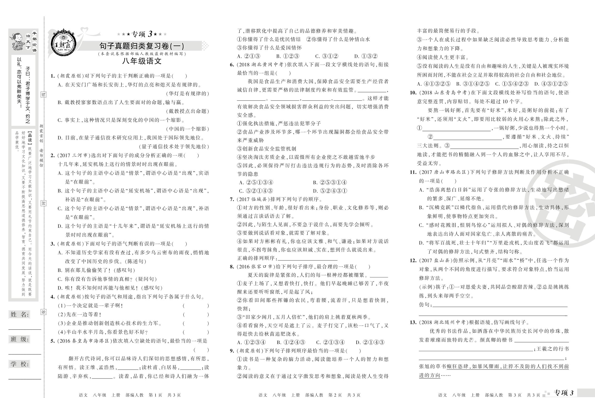 王朝霞期末专项卷——句子(一)(二)真题归类复习卷八年级上册语文(人教版)_R210802182138【0】