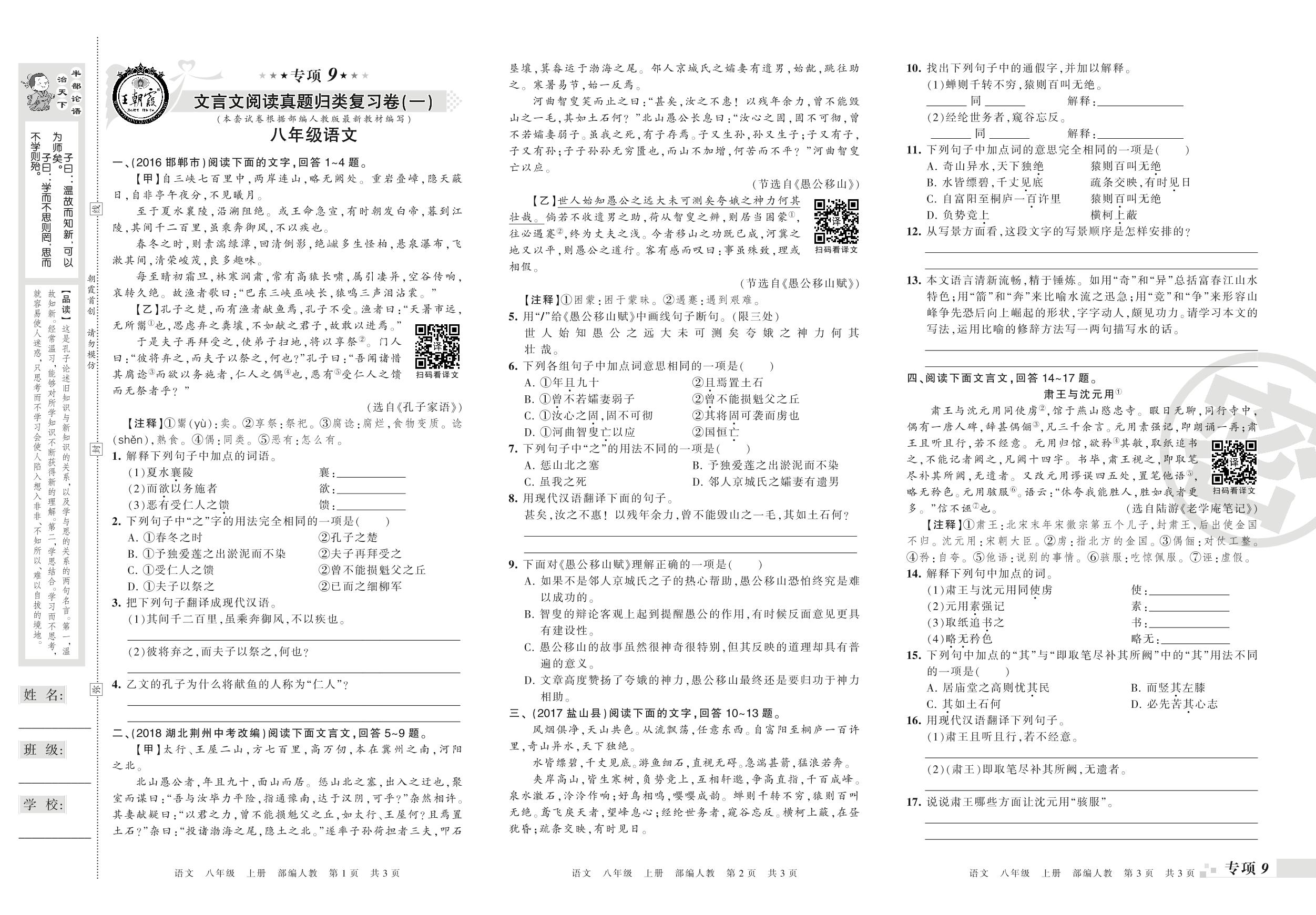 王朝霞期末专项卷——文言文阅读(一)(二)真题归类复习卷八年级上册语文(人教版)_R210802182200【0】