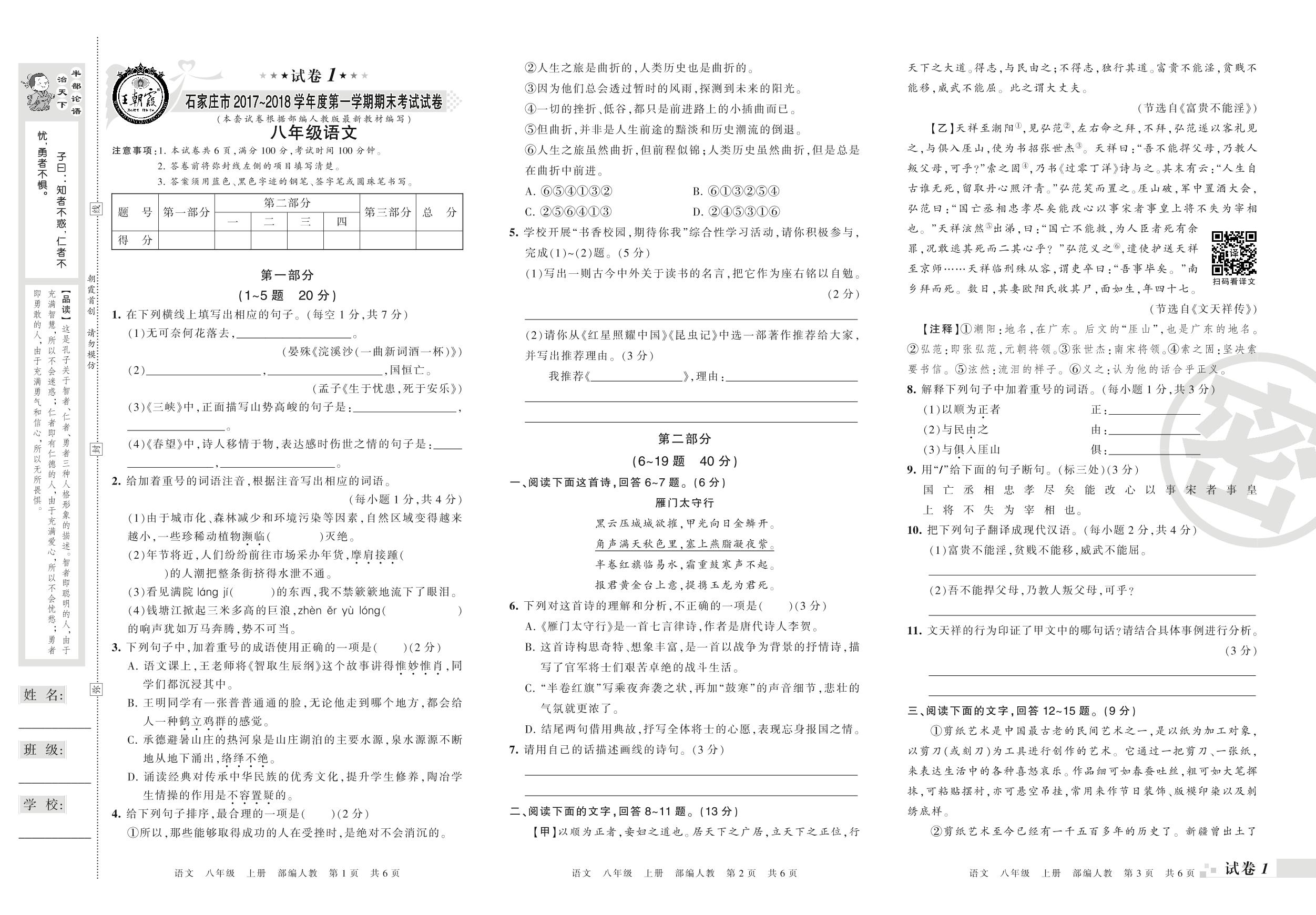 2017-2018学年第一学期石家庄市八年级语文试卷(人教版)【1】