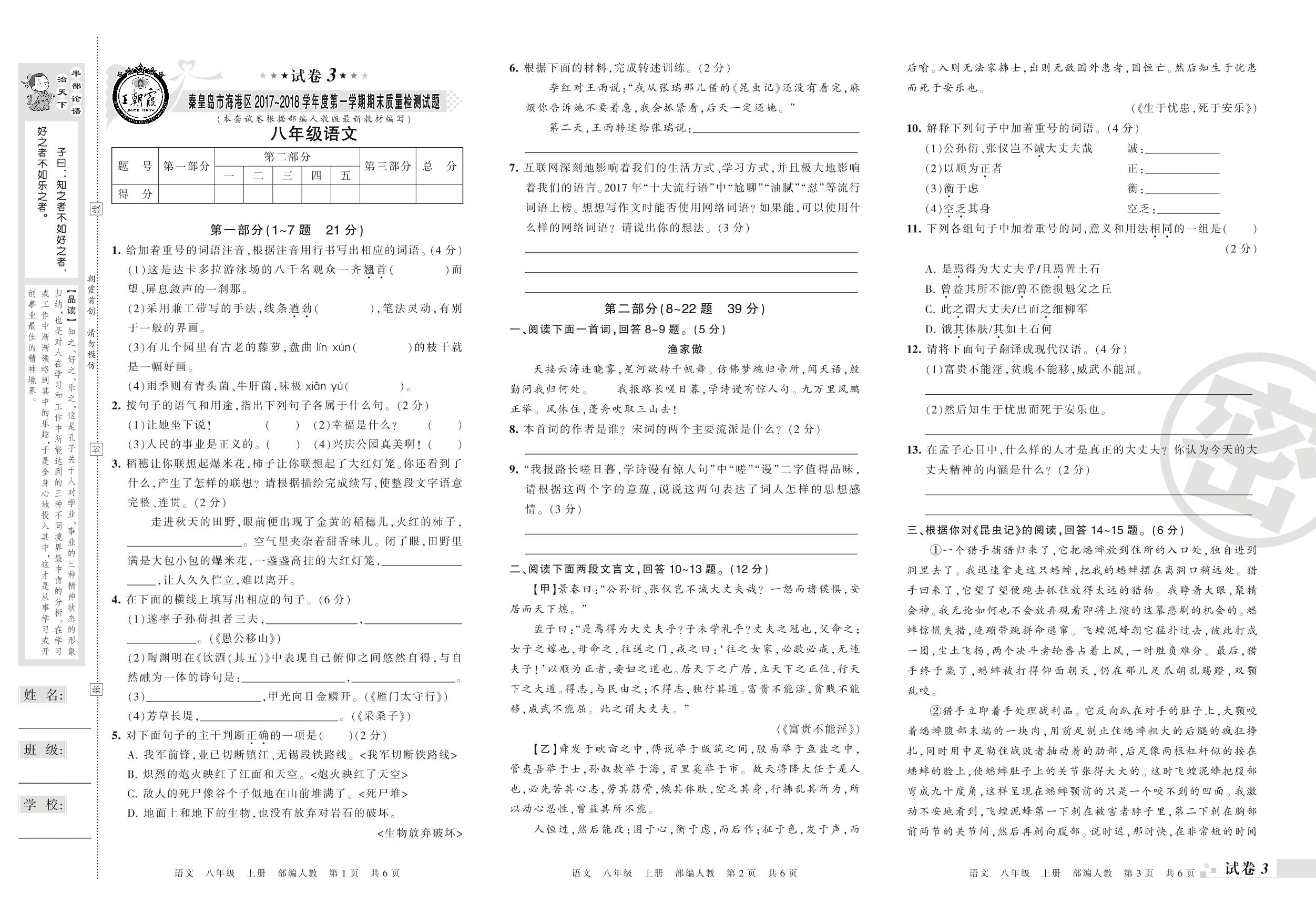 2017-2018学年第一学期秦皇岛市海港区八年级语文试卷(人教版)【3】