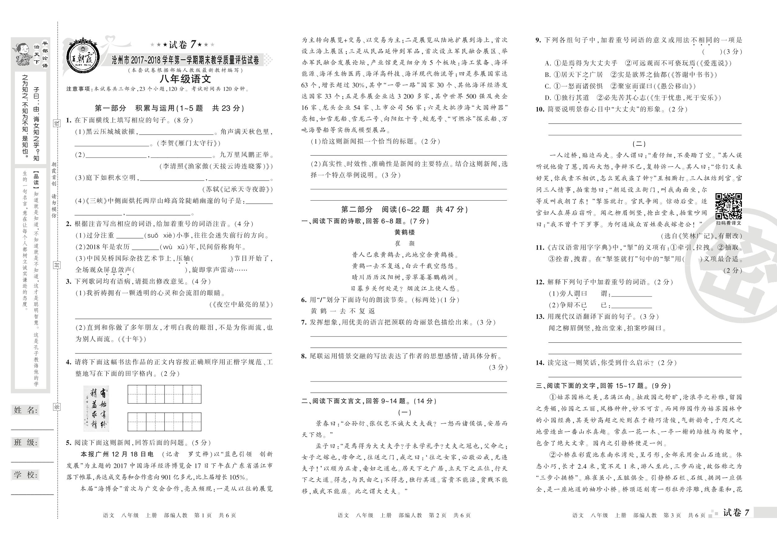 2017-2018学年第一学期沧州市八年级语文试卷(人教版)【7】
