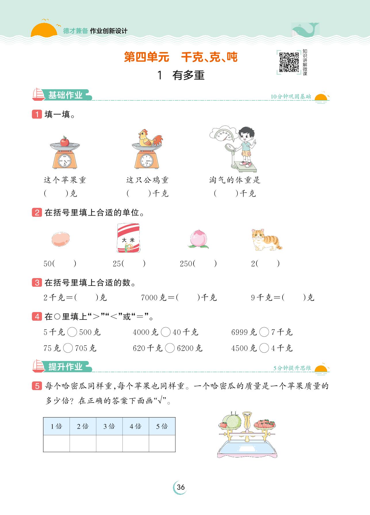 2023下册三年级数学北师版 第四单元 千克、克、吨——1 有多重