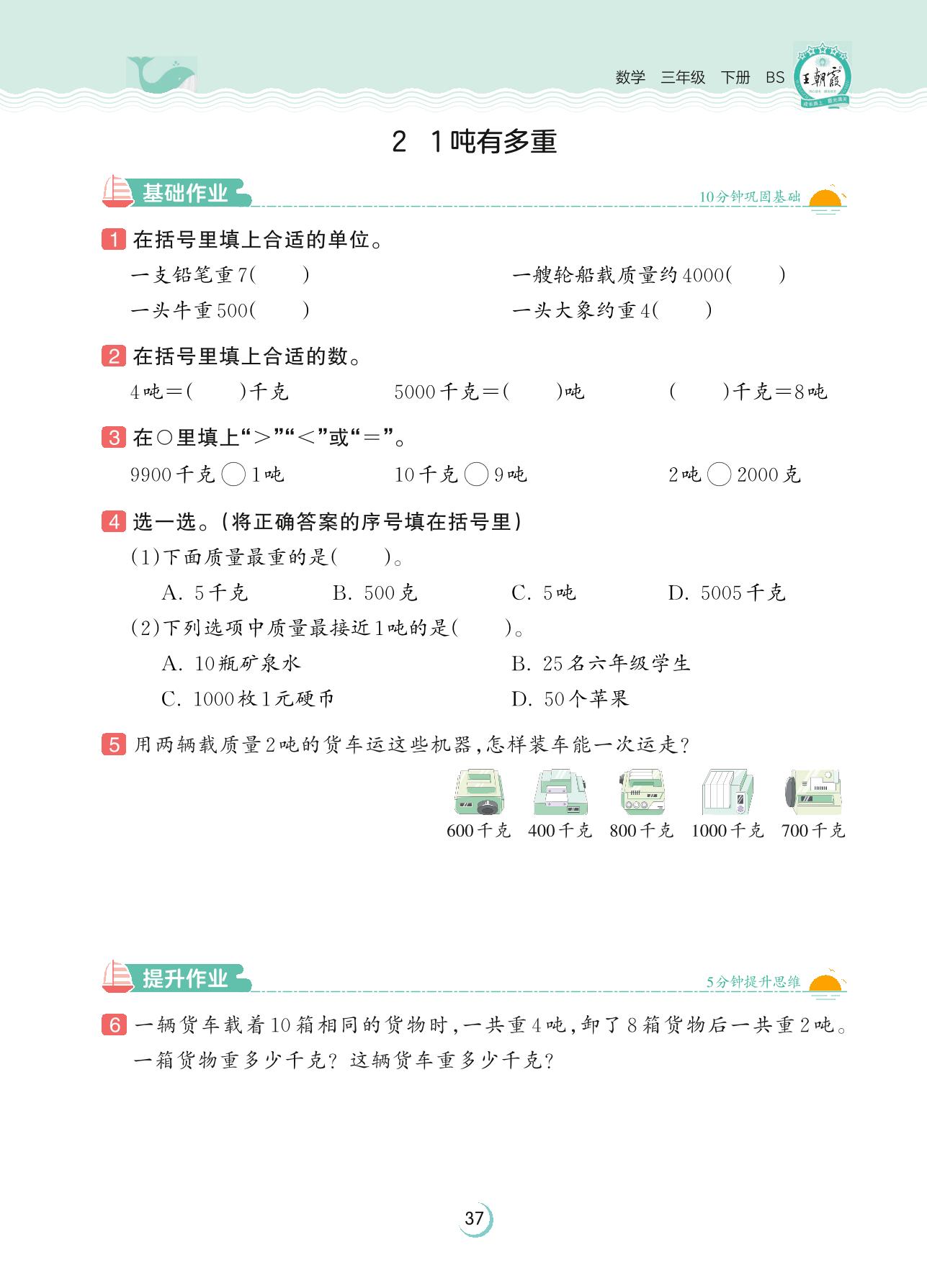 2023下册三年级数学北师版 第四单元 千克、克、吨——2 1吨有多重