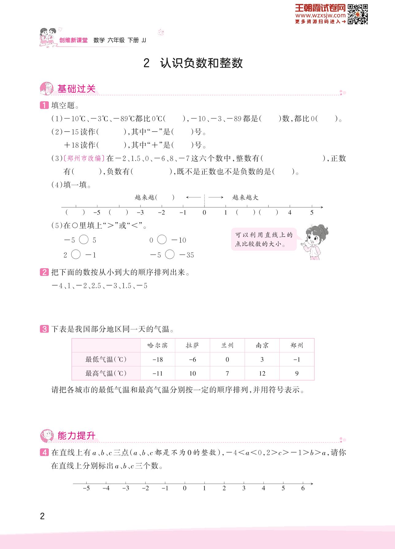 2023下册六年级数学冀教版 一 生活中的负数——2 认识负数和整数