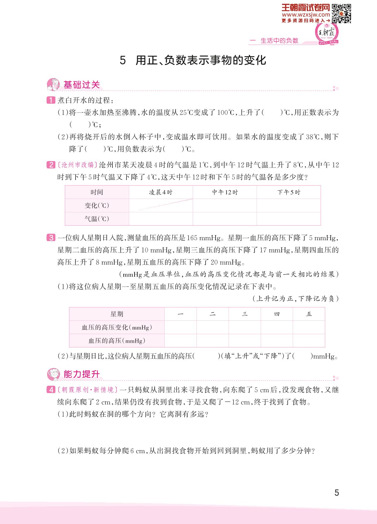 2023下册六年级数学冀教版 一 生活中的负数——5 用正、负数表示事物的变化