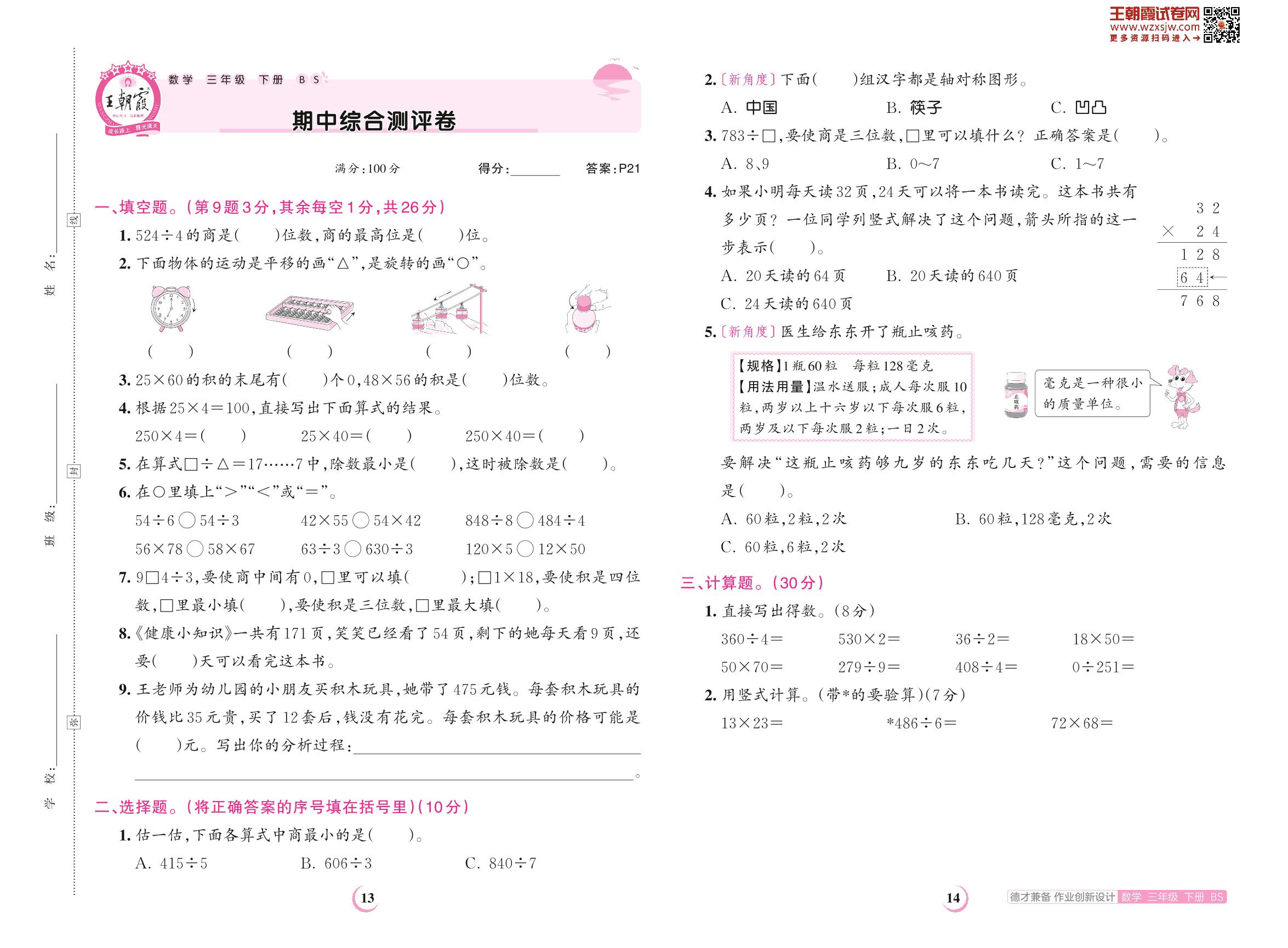 三年级数学北师版下册期中卷