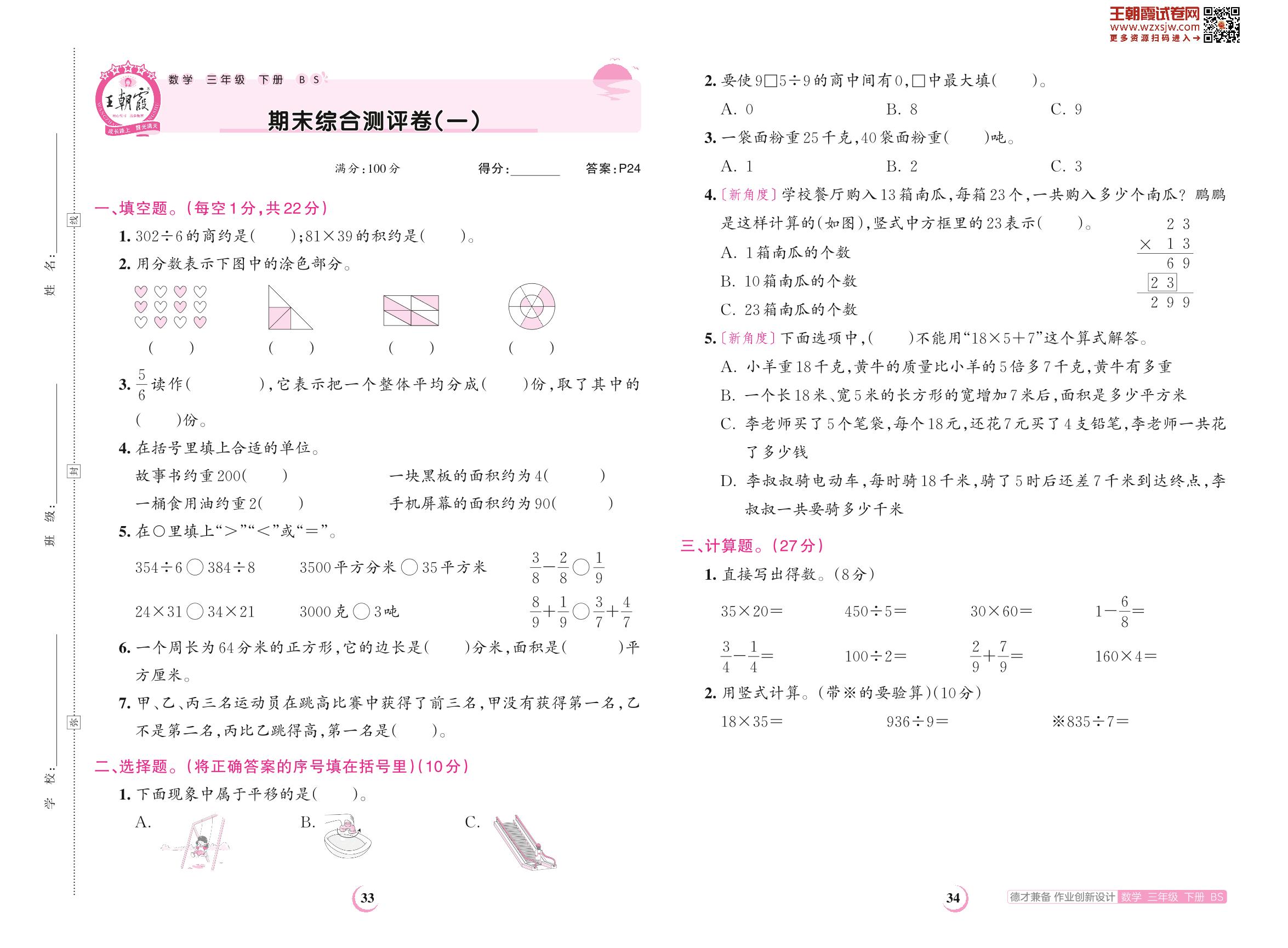 2023下册三年级数学北师版 期末综合测评卷(一)