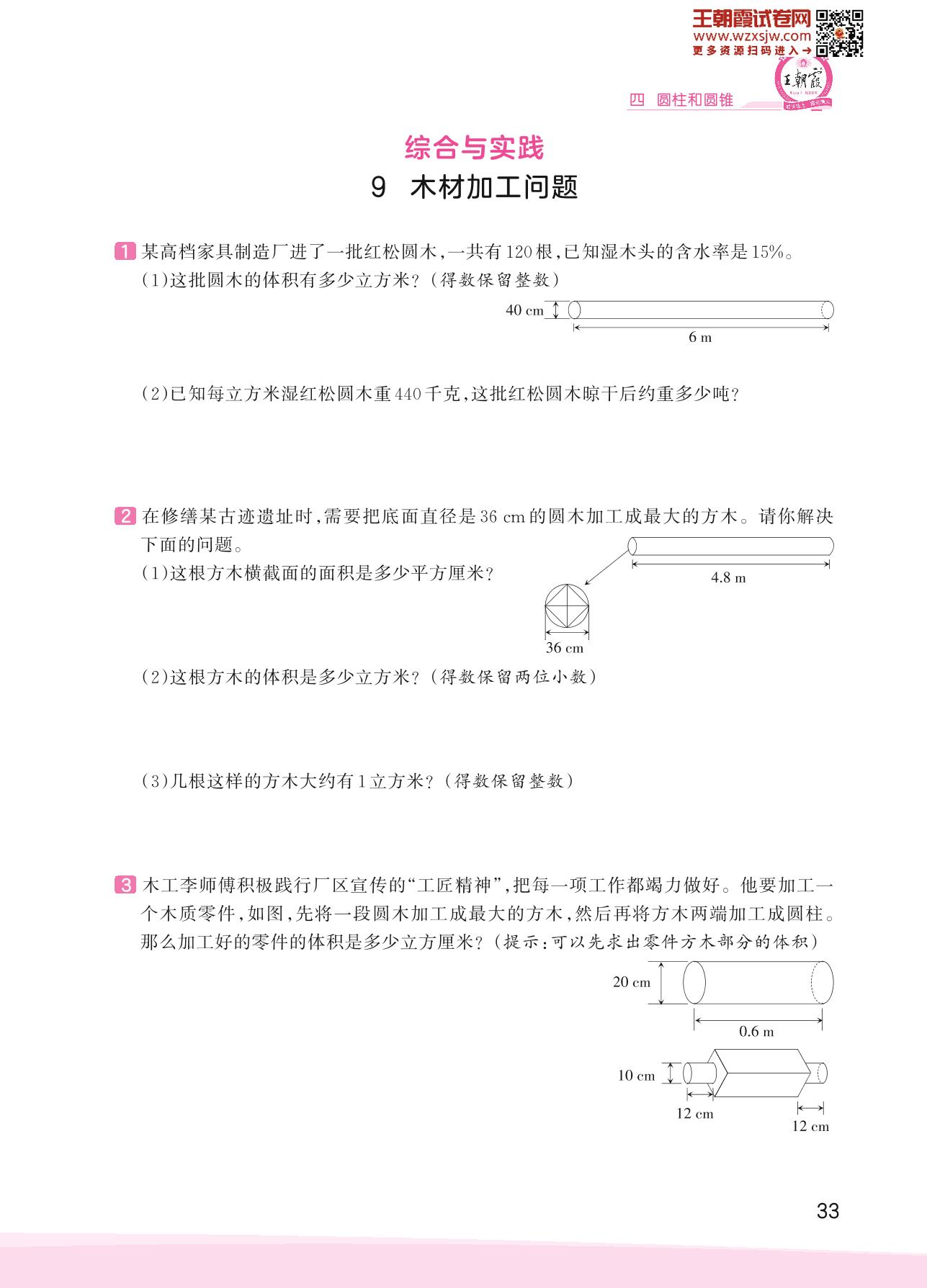 2023下册六年级数学冀教版 四 圆柱和圆锥——9 木材加工问题