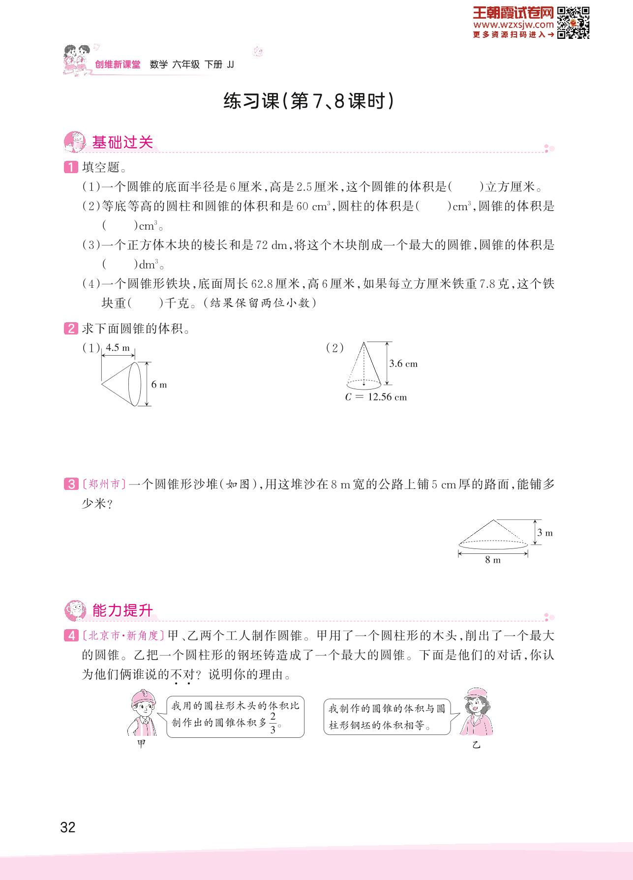 2023下册六年级数学冀教版 四 圆柱和圆锥——练习课(第7、8课时)